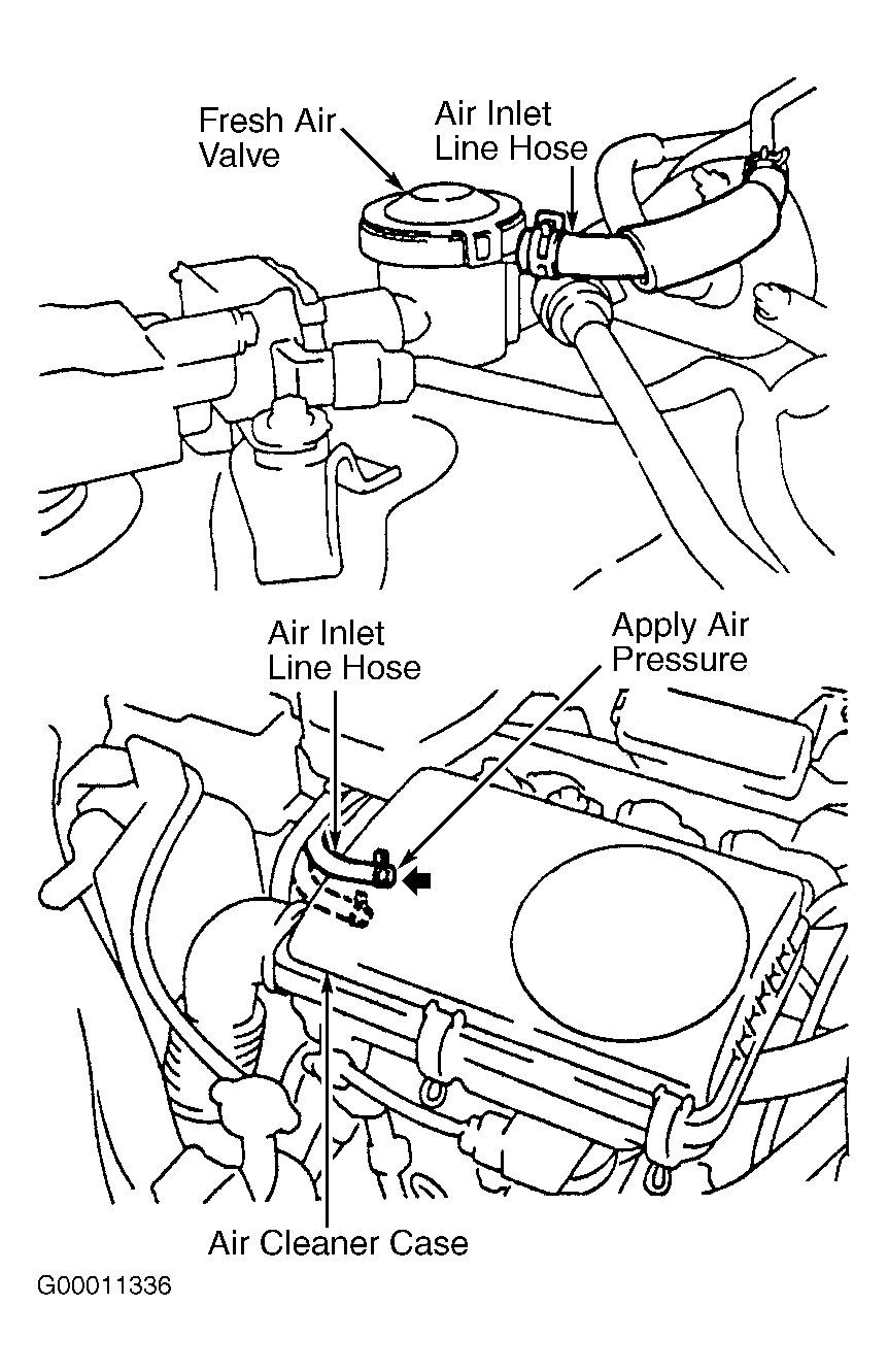 - To check air inlet line, disconnect air inlet line hose from fresh air valve and air cleaner case. See Fig 3. Fresh air valve is located on top of fuel tank. See Figure. Apply air pressure to air inlet line hose at air cleaner case. Ensure air flows from air inlet line hose at fresh air valve. If air flows from air inlet line hose, go to next step. If air does not flow from air inlet line hose, check for restrictions or damage to air inlet line and air inlet line hoses. If air inlet line or air inlet line hose is restricted, replace components as necessary.