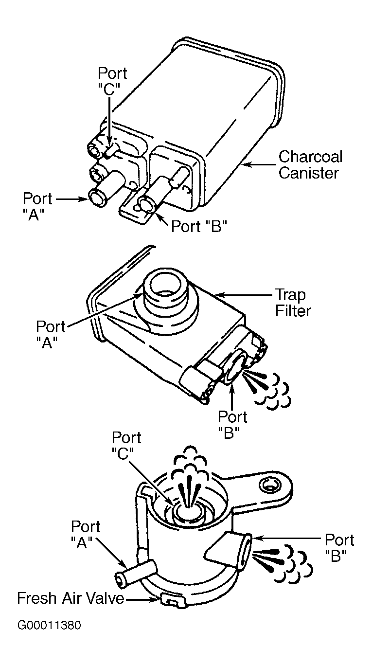 - Apply.71 psi (.05 kg/cm2 ) air pressure to port "A". Ensure air flows freely from all other ports on charcoal canister. Replace charcoal canister if defective. Reinstall charcoal canister on fuel tank.