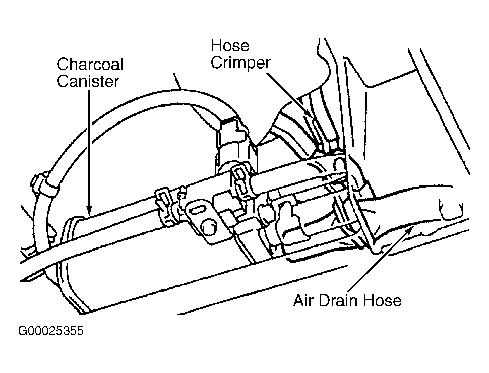 - Disconnect vacuum gauge from EVAP service port. Connect pressure gauge to EVAP service port. Install hose crimper on air drain hose near charcoal canister. See Fig 1. Charcoal canister is located near fuel tank. See Figure.