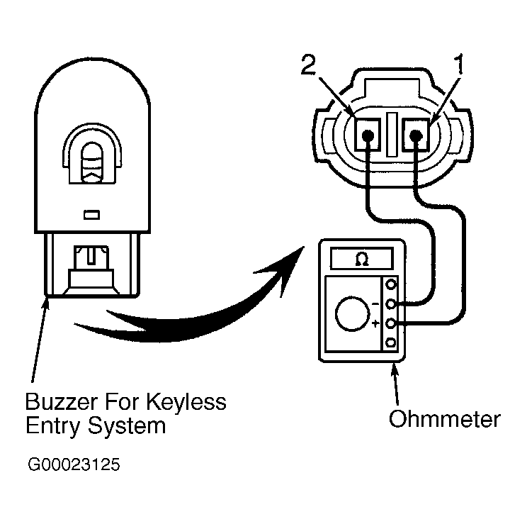 - Using ohmmeter, check resistance between electrical terminals on buzzer for keyless entry system with positive lead of ohmmeter connected to terminal No. 1 and negative lead to terminal No. 2. See Fig 1. Resistance should be approximately 1000 ohms. Replace buzzer for keyless entry system if resistance is not within specification.