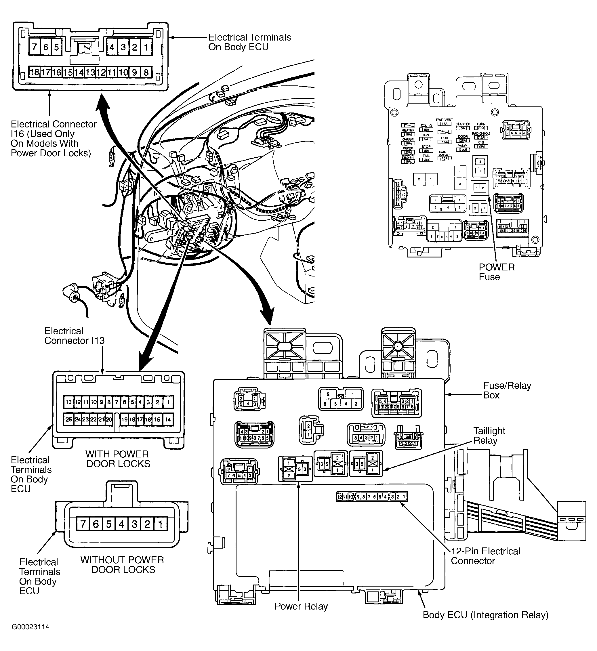 - Check wiring harness and electrical connectors between body ground and each door key lock and unlock switch, and between body Electronic Control Unit (ECU) and each door key lock and unlock switch. See WIRING DIAGRAMS in POWER DOOR LOCKS - TRUCKS (EXCEPT SEQUOIA) article. Body ECU may also be referred to as integration relay. Body ECU is located at driver's side of instrument panel on the fuse/relay box. See Figure. Electrical connector I13 (7-pin or 25-pin) and electrical connector I16 (18-pin) are located at body ECU and a 12-pin electrical connector is located at rear of body ECU. See Figure. If wiring harness and electrical connectors are okay, go to next step. If wiring harness or electrical connector is defective, repair as necessary and recheck power door lock system operation.