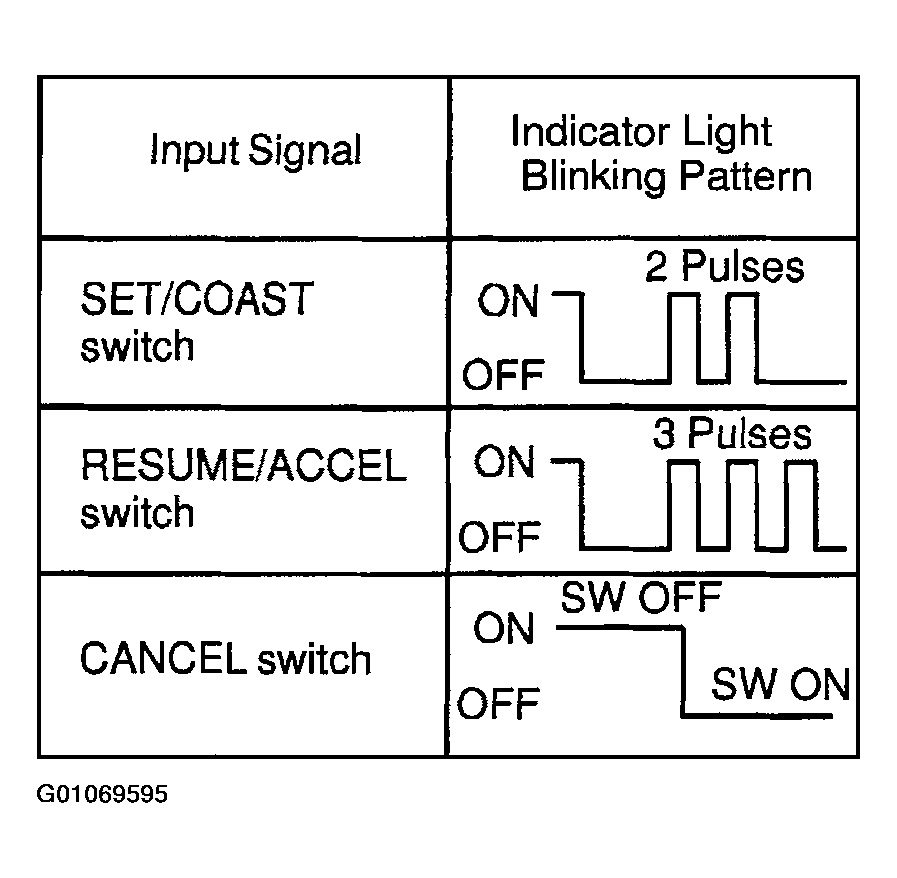 - Check the indicator light operation when each of the SET/COAST, RESUME/ACCEL and CANCEL switches is turned on.