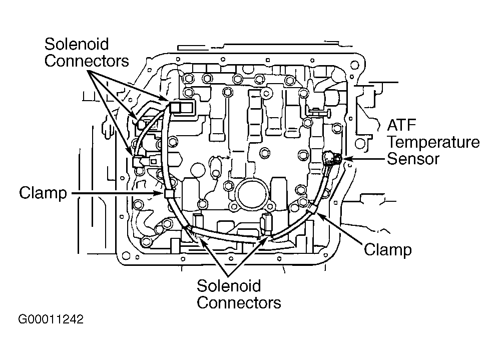 ATF temperature sensor (located on wiring harness inside transaxle oil pan) converts fluid temperature into a resistance value, which is input to ECM. See Fig 2.