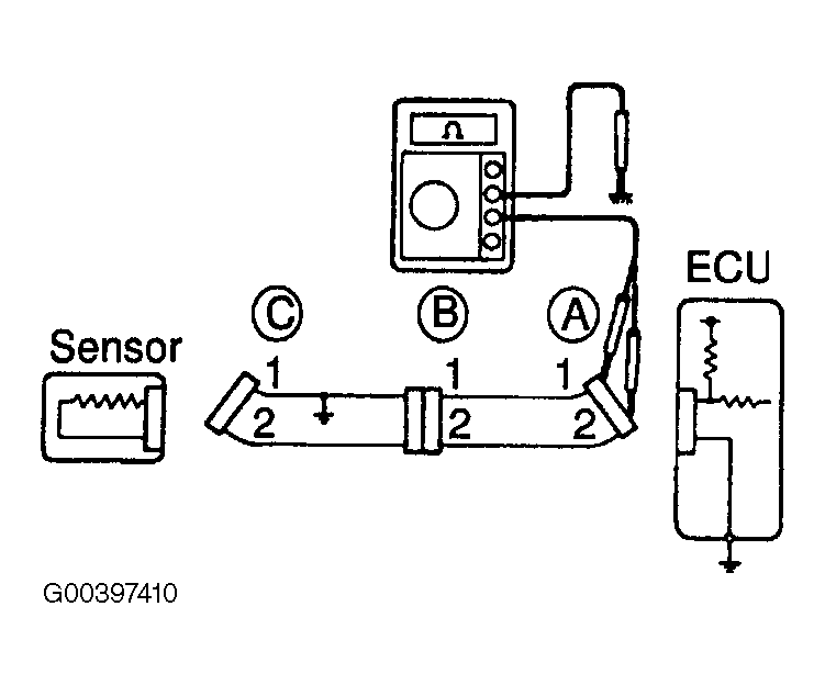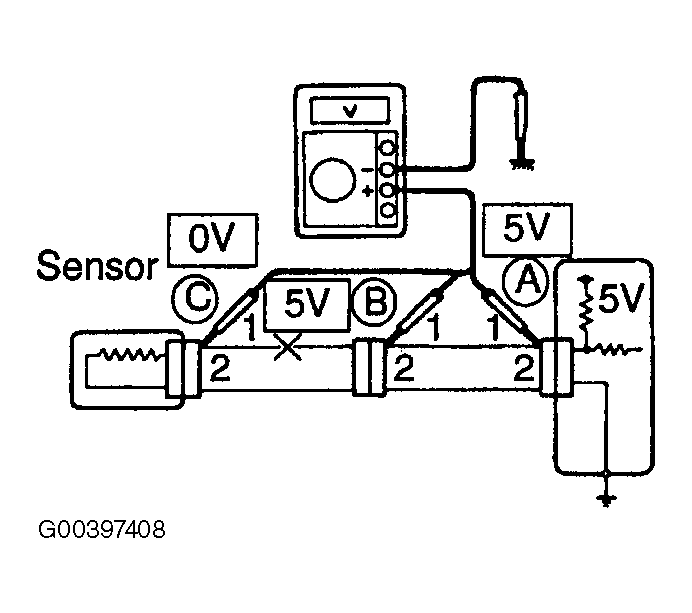 As shown in Fig 12, with each connector still connected, measure the voltage between body ground and terminal 1 of connector "A" at the ECU 5V output terminal, terminal 1 of connector "B", and terminal 1 of connector "C", in that order.