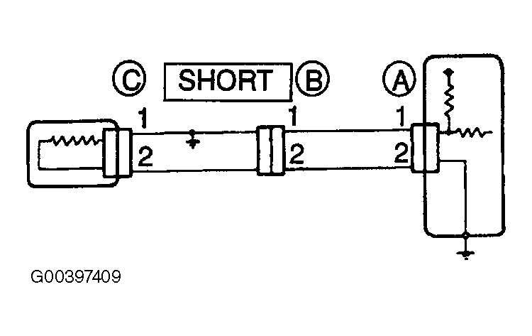 1. Between terminal 1 of connector "A" and body ground there is continuity (short).
