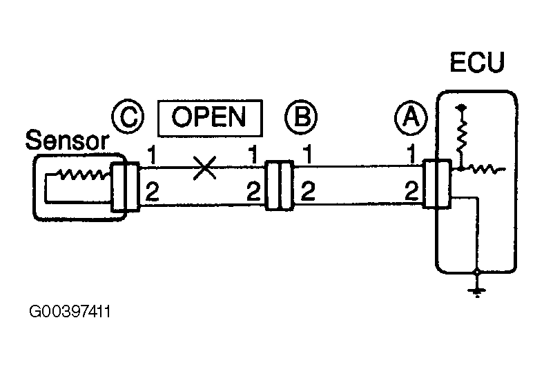 1. Between terminal 1 of connector "A" and terminal 1 of connector "C", if no continuity (open).