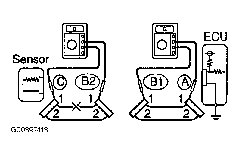 Therefore, it is found that there is an open circuit between terminal 1 of connector "B2" and terminal 1 of connector "C".