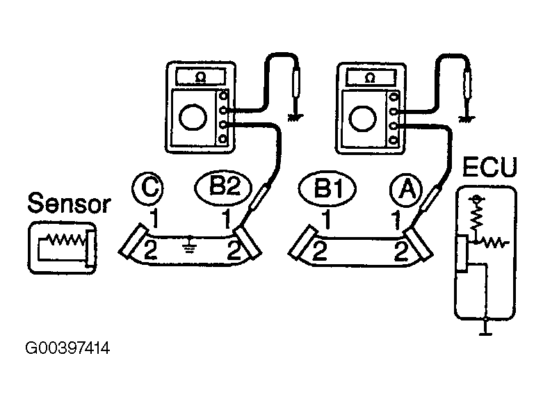 2. Disconnect connector "B" and measure the resistance between terminal 1 of connector "A" and body ground, and terminal 1 of connector "B2" and body ground.