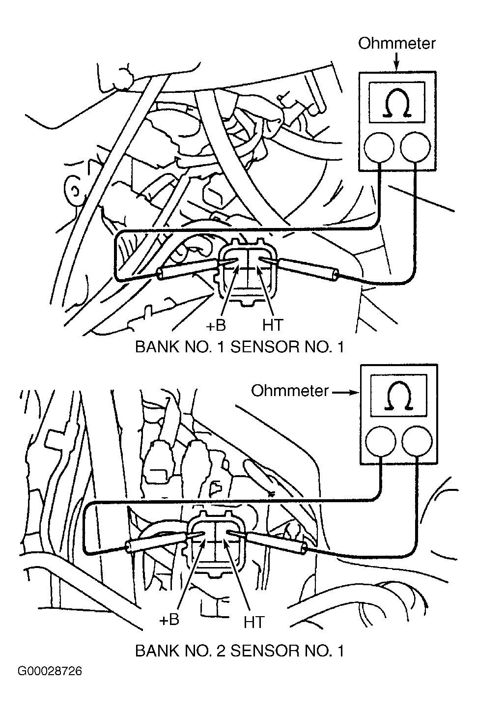 5. Disconnect electrical connector for A/F sensor. Using ohmmeter, check resistance for heater on A/F sensor between +B and HT terminals on electrical connector for A/F sensor. See Fig 1. Resistance should be .8-1.4 ohms at 68°F (20°C) and 1.8-3.2 ohms at 1472°F (800°C). If resistance is within specification, go to next step. If resistance is not within specification, replace A/F sensor. See AIR/FUEL SENSOR under ENGINE SENSORS & SWITCHES in REMOVAL, OVERHAUL & INSTALLATION - 4-CYLINDER article.