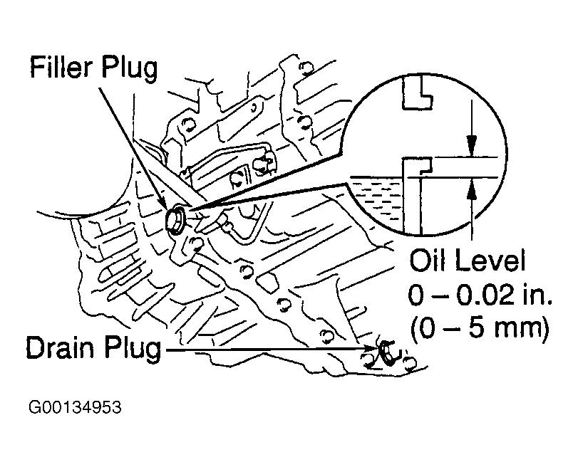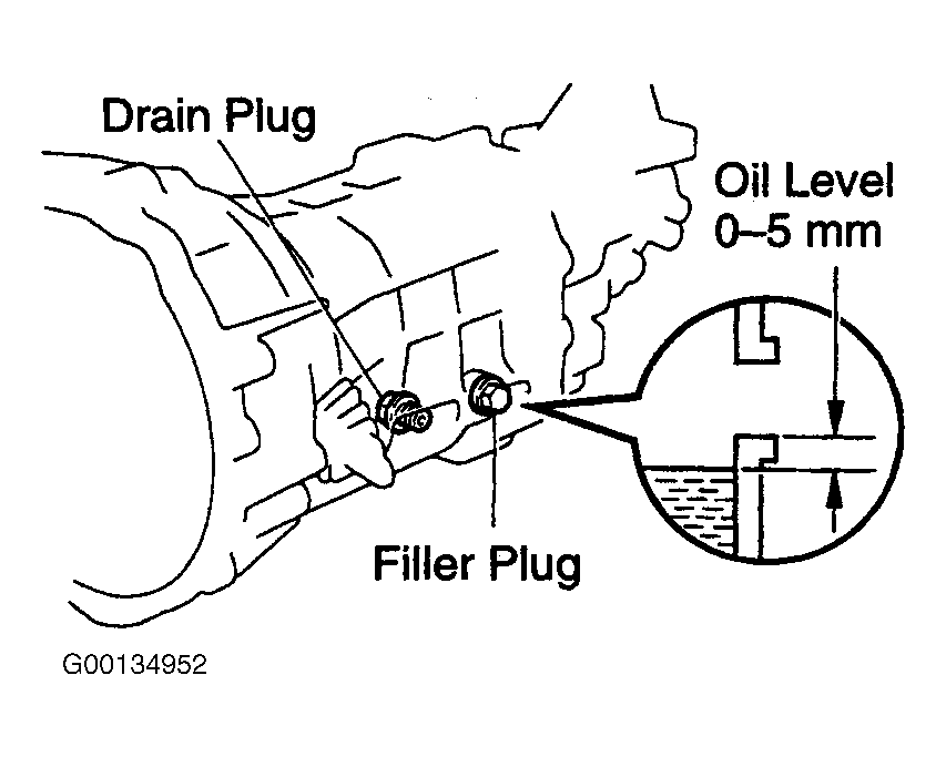 Raise and support the vehicle. Ensure vehicle is level. Remove fill plug from transaxle/transmission. Fluid should be level with bottom edge of fill plug hole. See Fig 1-Fig 3 . If fluid is low, fill with appropriate fluid until fluid is level with fill plug opening. See RECOMMENDED FLUIDS . Reinstall fill plug. Tighten to specification. See TORQUE SPECIFICATIONS .