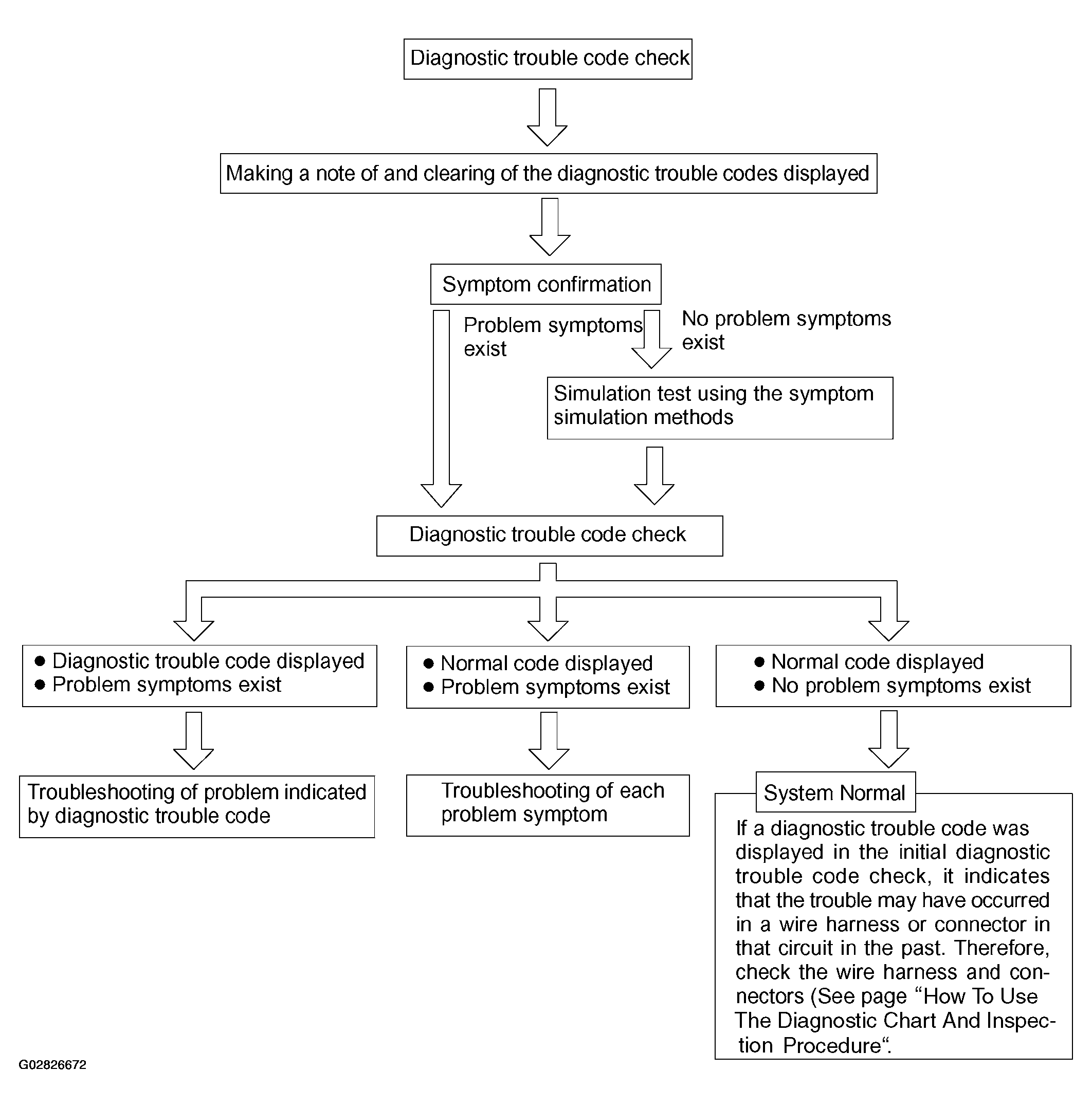 Taking into account the points in 2 , a flow chart showing how to proceed with troubleshooting using the diagnostic trouble code check is shown in Fig 5. This flow chart shows how to utilize the diagnostic trouble code check effectively, then by carefully checking the results, indicates how to proceed either to diagnostic trouble code troubleshooting or to troubleshooting of problem symptoms table.