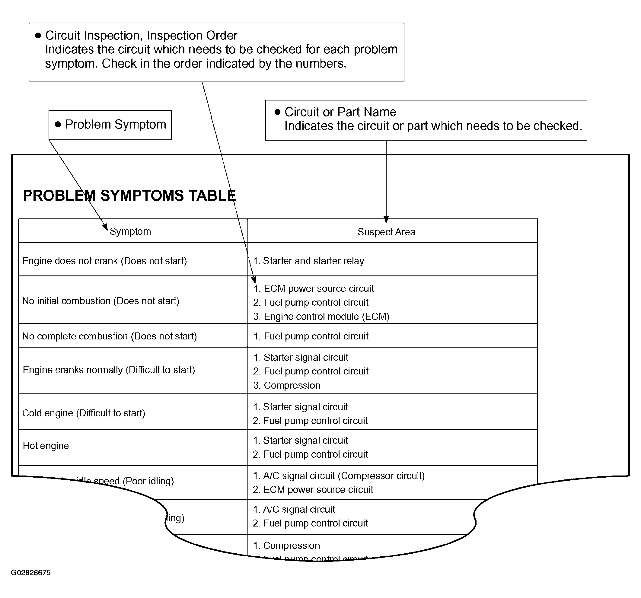 The suspected circuits or parts for each problem symptom are shown in Fig 8. Use this table to troubleshoot the problem when a "Normal" code is displayed in the diagnostic trouble code check but the problem is still occurring. Numbers in the table indicate the inspection order in which the circuits or parts should be checked.