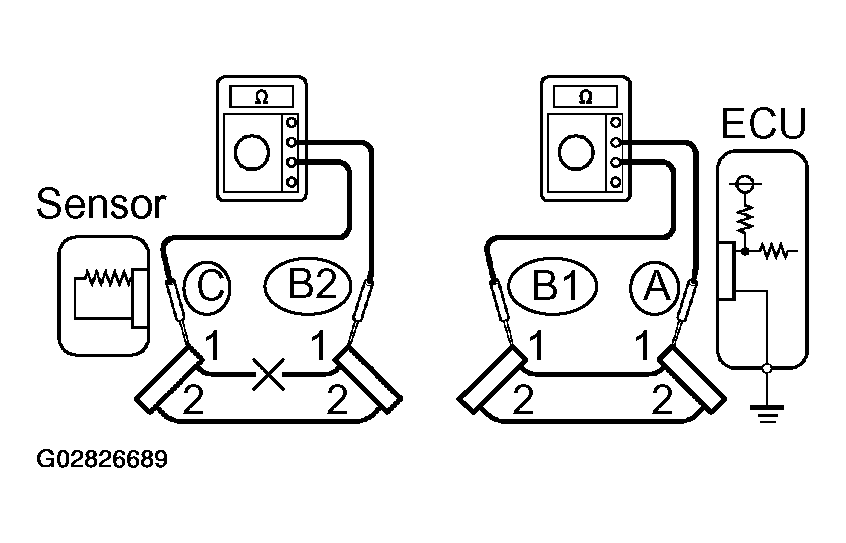 Therefore, it is found out that there is an open circuit between terminal 1 of connector "B2" and terminal 1 of connector "C".