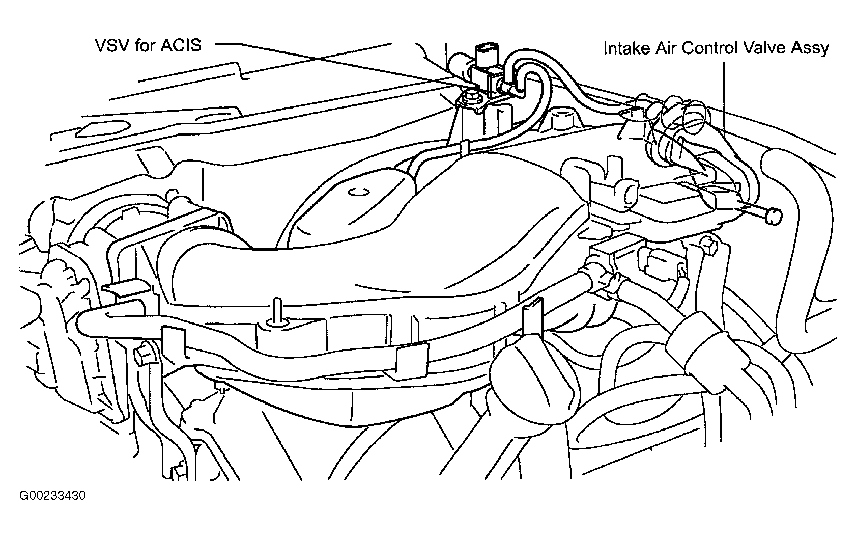 - Disconnect electrical connector and vacuum hoses from intake air control valve Vacuum Switching Valve (VSV). Intake air control valve VSV may also be referred to as VSV No. 1. Remove intake air control valve VSV. See Fig 1.