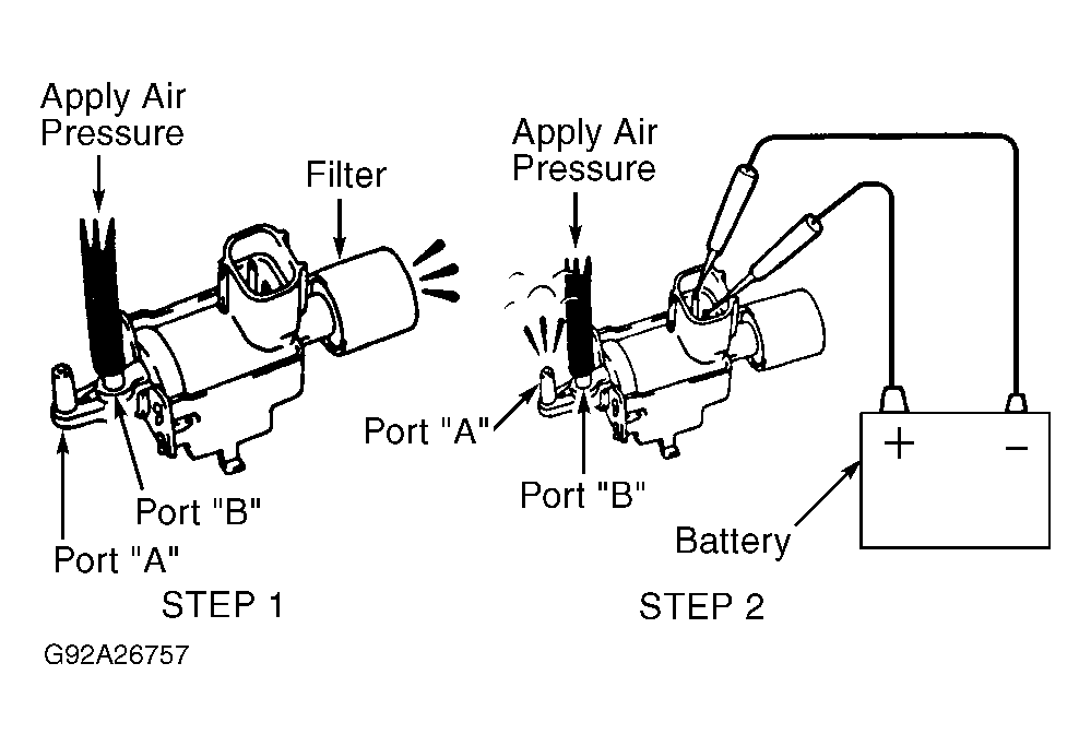 - Apply battery voltage and ground to electrical terminals on intake air control valve VSV. Apply air pressure to port "B" on intake air control valve VSV. Ensure air flows from port "A" and not from the filter. Perform STEP 2 in illustration. See Figure. If intake air control valve VSV operates properly, reinstall intake air control valve VSV and go to next step. If intake air control valve VSV does not operate properly, replace intake air control valve VSV and recheck system operation.