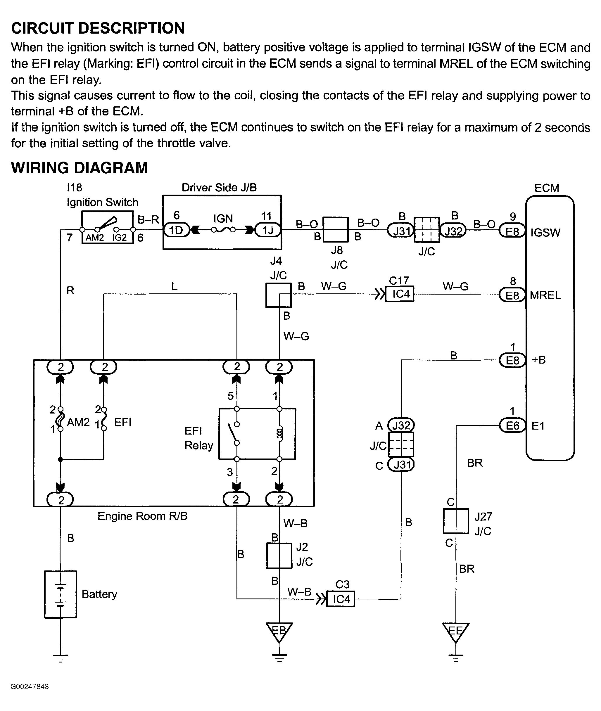 For engine control module power source circuit inspection, see Fig 1-Fig 7 . For circuit identification, see ENGINE PERFORMANCE in appropriate SYSTEM WIRING DIAGRAMS article in ELECTRICAL. Before replacing ECM, check ECM connectors and ground circuits. See ENGINE CONTROL MODULE POWER & GROUND CIRCUITS under COMPUTERIZED ENGINE CONTROLS. To check EFI main relay, see EFI MAIN RELAY under MODULES, MOTORS, RELAYS & SOLENOIDS.