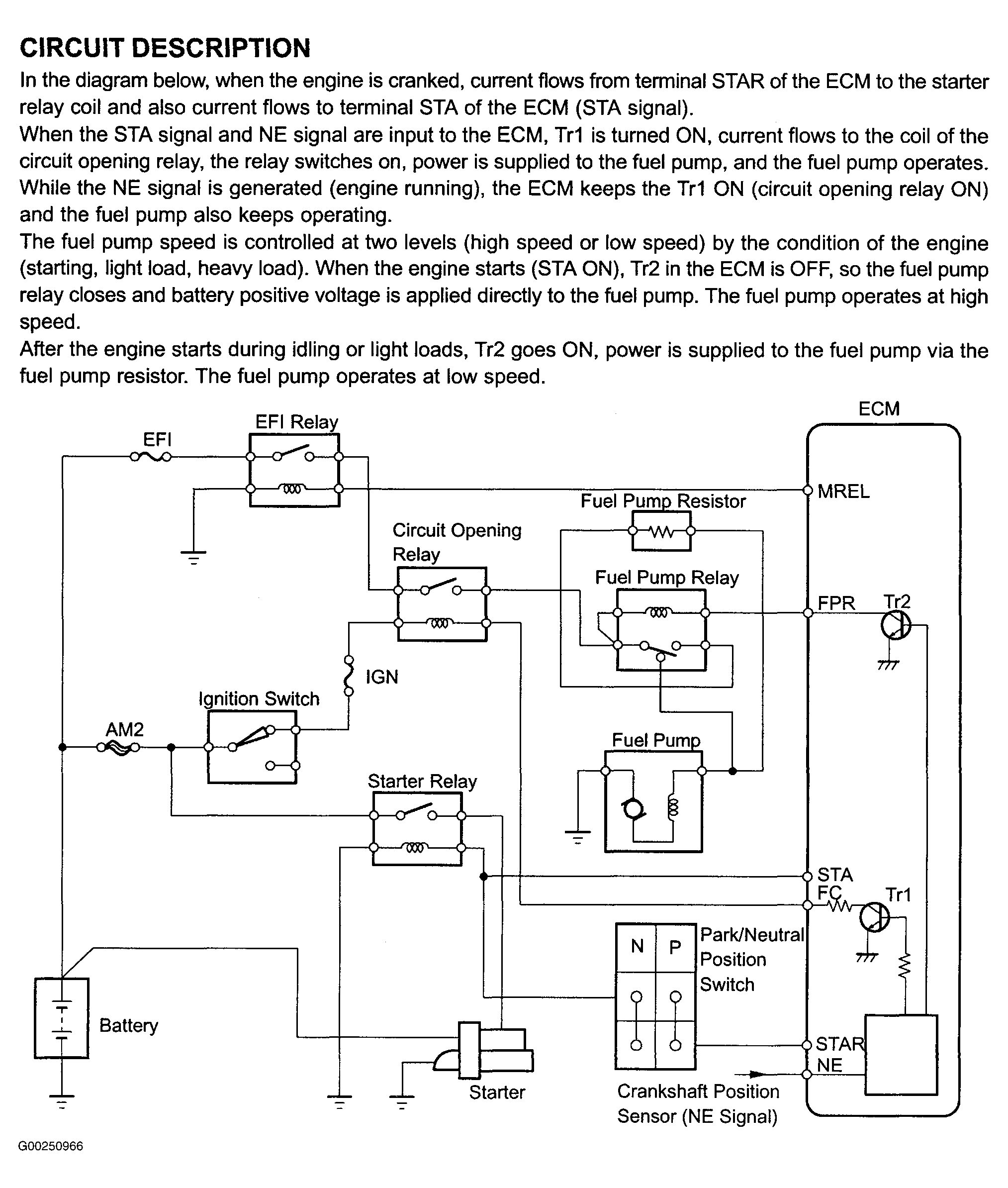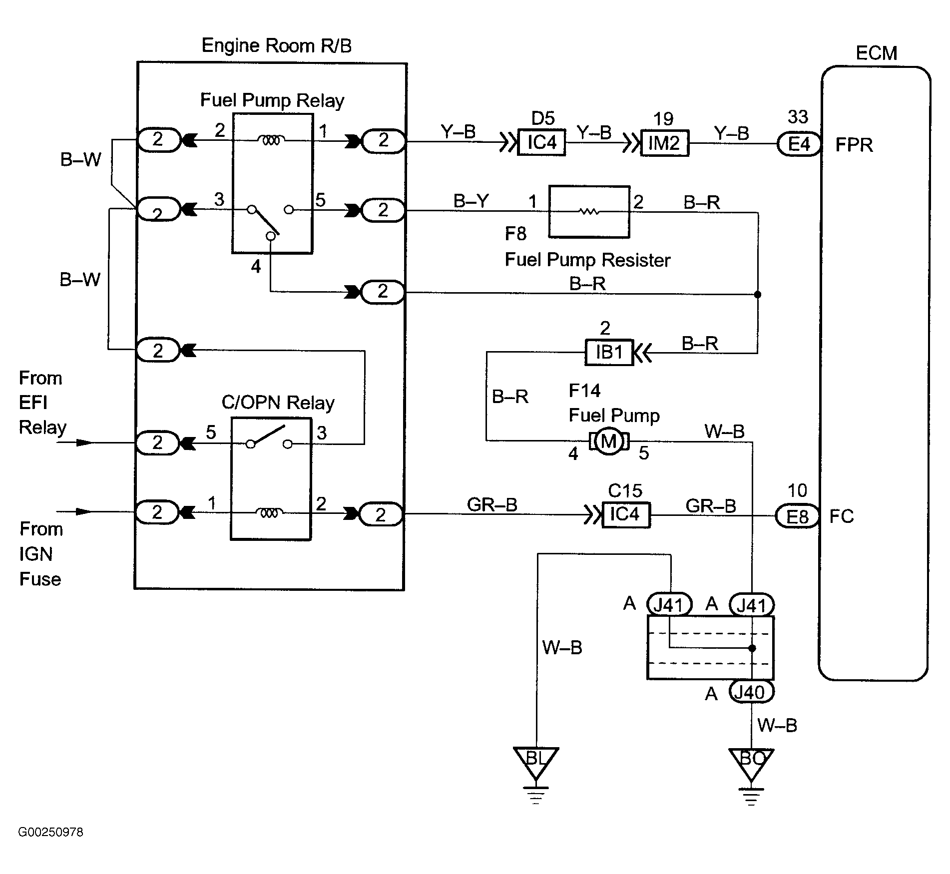 For fuel pump control circuit description and inspection, see Figure and Figure-Figure . For fuel pump control circuit wiring diagram, see Figure. To check ECM power source circuit, see ENGINE CONTROL MODULE POWER SOURCE CIRCUIT . For circuit identification, see ENGINE PERFORMANCE in appropriate SYSTEM WIRING DIAGRAMS article in ELECTRICAL. Before replacing ECM, check ECM connectors and ground circuits. See ENGINE CONTROL MODULE POWER & GROUND CIRCUITS under COMPUTERIZED ENGINE CONTROLS.
