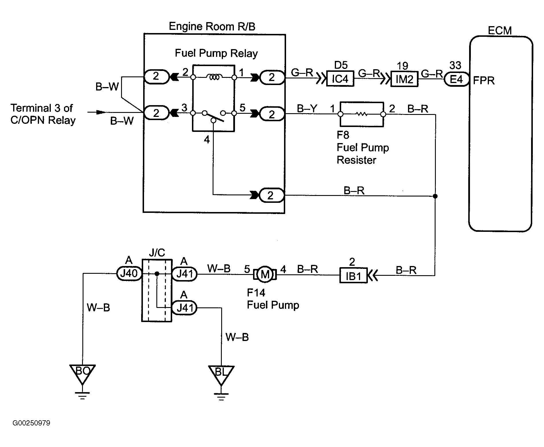 . For fuel pump control circuit wiring diagram, see Fig 14. To check ECM power source circuit, see ENGINE CONTROL MODULE POWER SOURCE CIRCUIT . For circuit identification, see ENGINE PERFORMANCE in appropriate SYSTEM WIRING DIAGRAMS article in ELECTRICAL. Before replacing ECM, check ECM connectors and ground circuits. See ENGINE CONTROL MODULE POWER & GROUND CIRCUITS under COMPUTERIZED ENGINE CONTROLS.