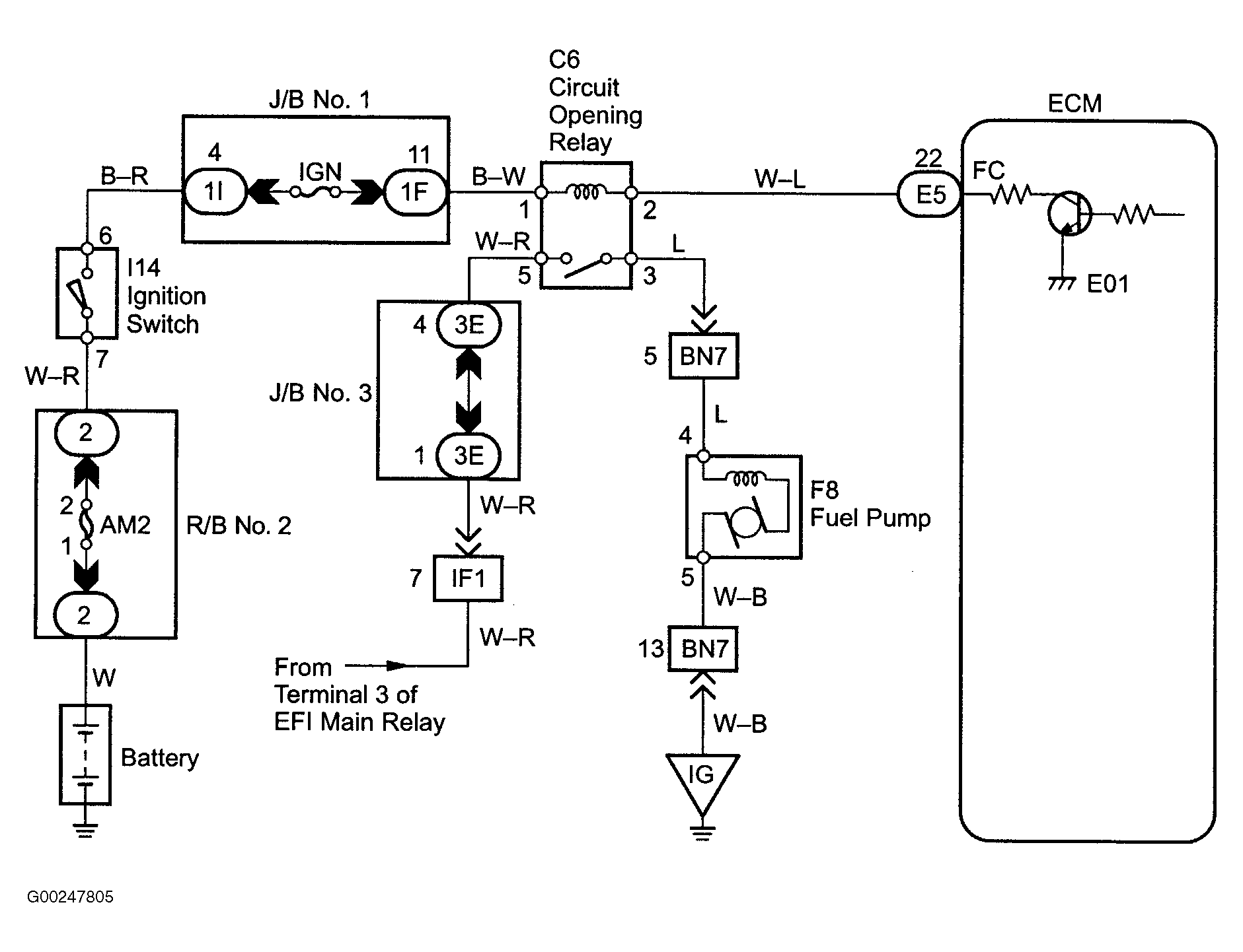 For fuel pump control circuit inspection and wiring diagram, see Fig 1-Fig 8 . To check fuel pump operation, see FUEL DELIVERY under FUEL SYSTEMS. To check circuit opening relay, see CIRCUIT OPENING RELAY under MODULES, MOTORS, RELAYS & SOLENOIDS. For circuit identification, see ENGINE PERFORMANCE in appropriate SYSTEM WIRING DIAGRAMS article in ELECTRICAL. Before replacing ECM, check ECM connectors and ground circuits. See ENGINE CONTROL MODULE POWER & GROUND CIRCUITS under COMPUTERIZED ENGINE CONTROLS.