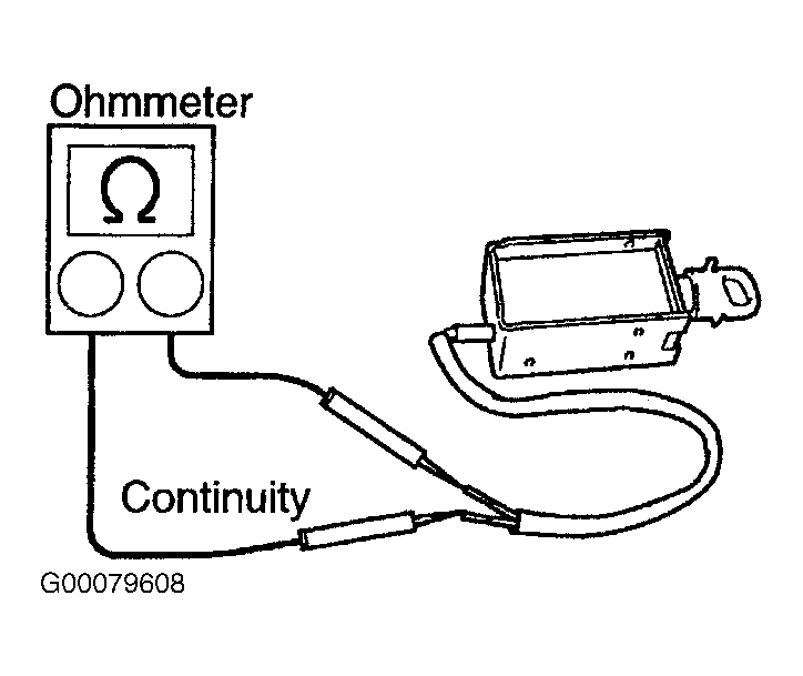 Remove shift lock solenoid. See SHIFT LEVER under REMOVAL & INSTALLATION. Using an ohmmeter, check that there is continuity between the terminals. See Fig 1. If there is no continuity, replace the shift lock solenoid.