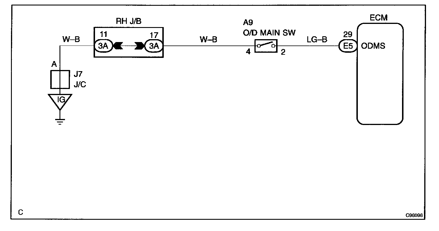 CIRCUIT DESCRIPTIONThe O/D main switch is a momentary type switch. When pressing the O/D main switch, the O/D OFF indicator light lights up and the ECM prohibits shifting into O/D, and when pressing it once again, the O/D OFF indicator comes on off and the ECM allows shifting into O/D. Turning the IG switch OFF will reset the O/D OFF indicator light.