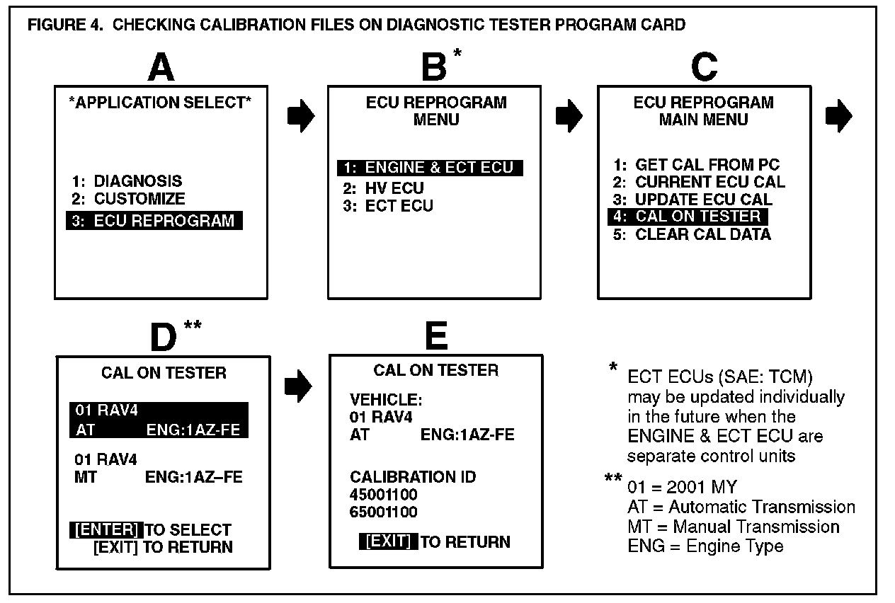 A. Before downloading a new calibration file from TIS, check the current calibration files stored on the Diagnostic Tester Program Card by following the screen flow shown (Figure 4).