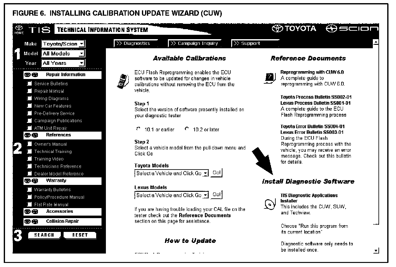 If the CUW does not launch, or the version is older than 6.0, install Diagnostic Software (TIS Diagnostic Applications Installer). Specific installation instructions (Reprogramming with CUW 6.0) are located under Diagnostics ECU Flash Reprogramming (Figure 6).