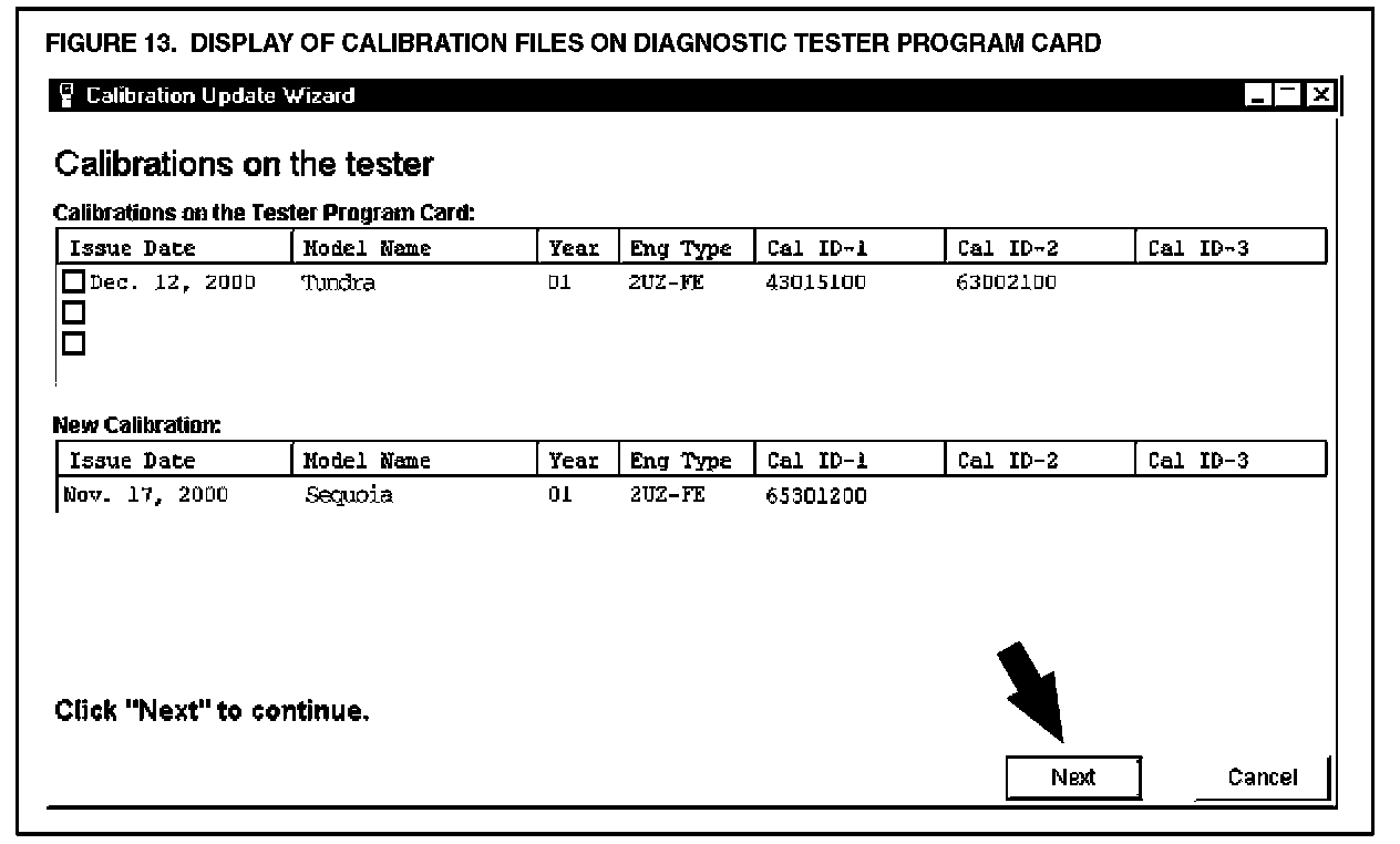 J. The top half of the CUW screen displays the calibrations currently stored on the Diagnostic Tester Program Card. The bottom half of the screen displays the new calibration to be loaded onto the Diagnostic Tester Program Card (see Figure 13). Click NEXT to continue the process.