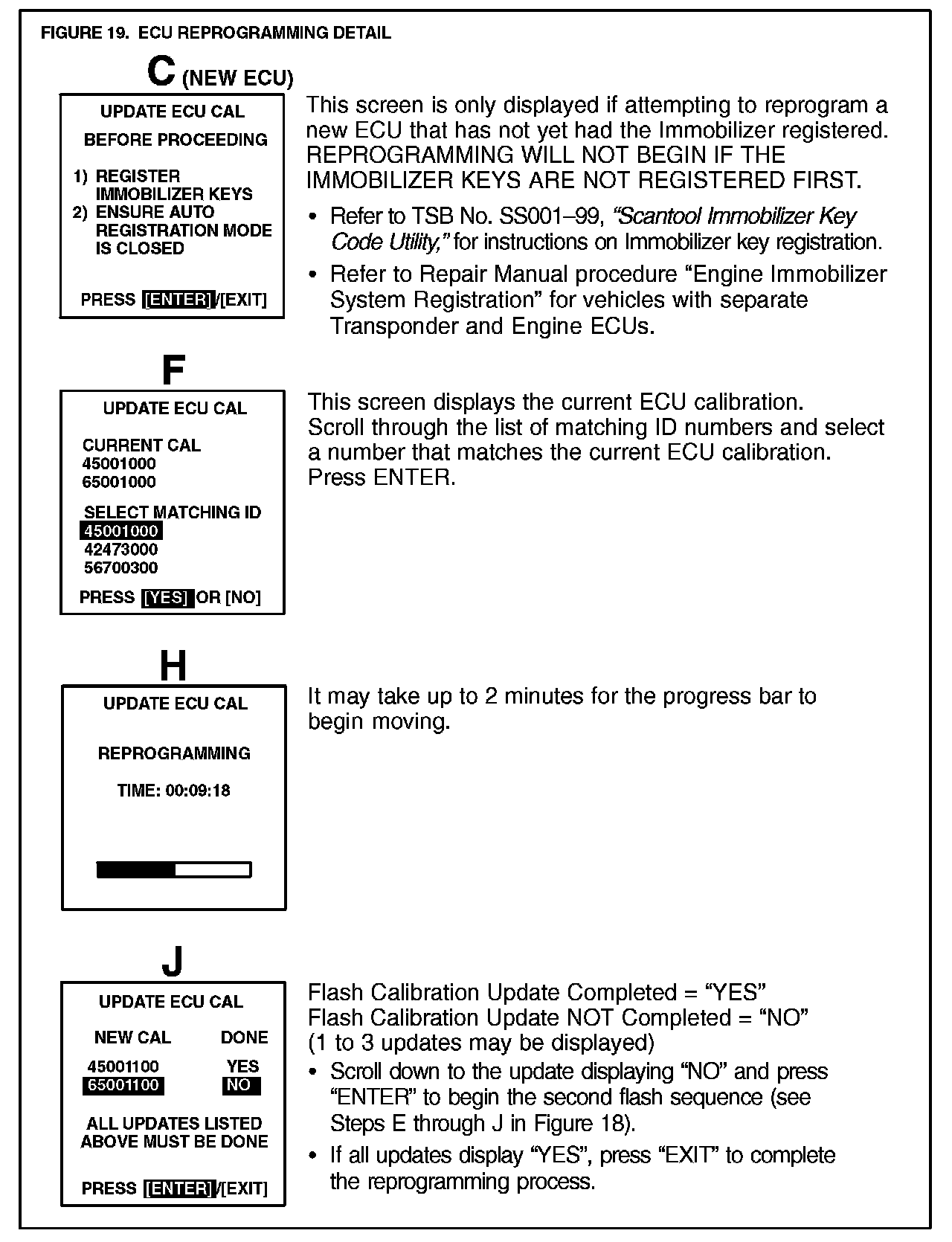 B. Continue to update the ECU calibration file following the screen flow (Figure 18). Details for selected screens are shown in Figure 19.
