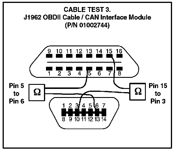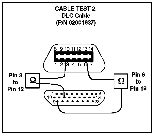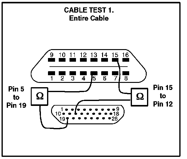 To determine if the Diagnostic Tester cable is damaged, follow the test procedures below to check the electrical integrity of the cable. Conduct all continuity tests with an Ohm meter. For all five test procedures, the resistance values must be below 6.0 ohms to pass.