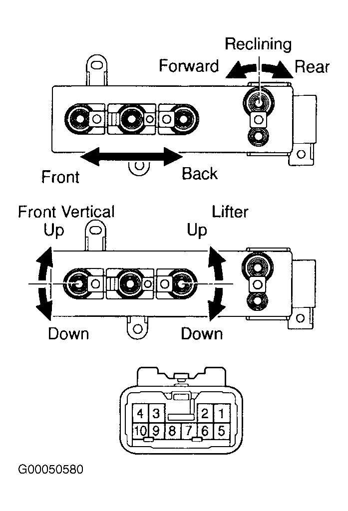 Turn ignition off. Remove seat. See POWER SEAT under REMOVAL & INSTALLATION. Disconnect 10-pin electrical harness connector from power seat control switch. Remove power seat control switch. Check continuity between specified terminals of power seat control switch. See POWER SEAT CONTROL SWITCH CONTINUITY TEST table. Replace power seat control switch if continuity does not exist between specified terminals.