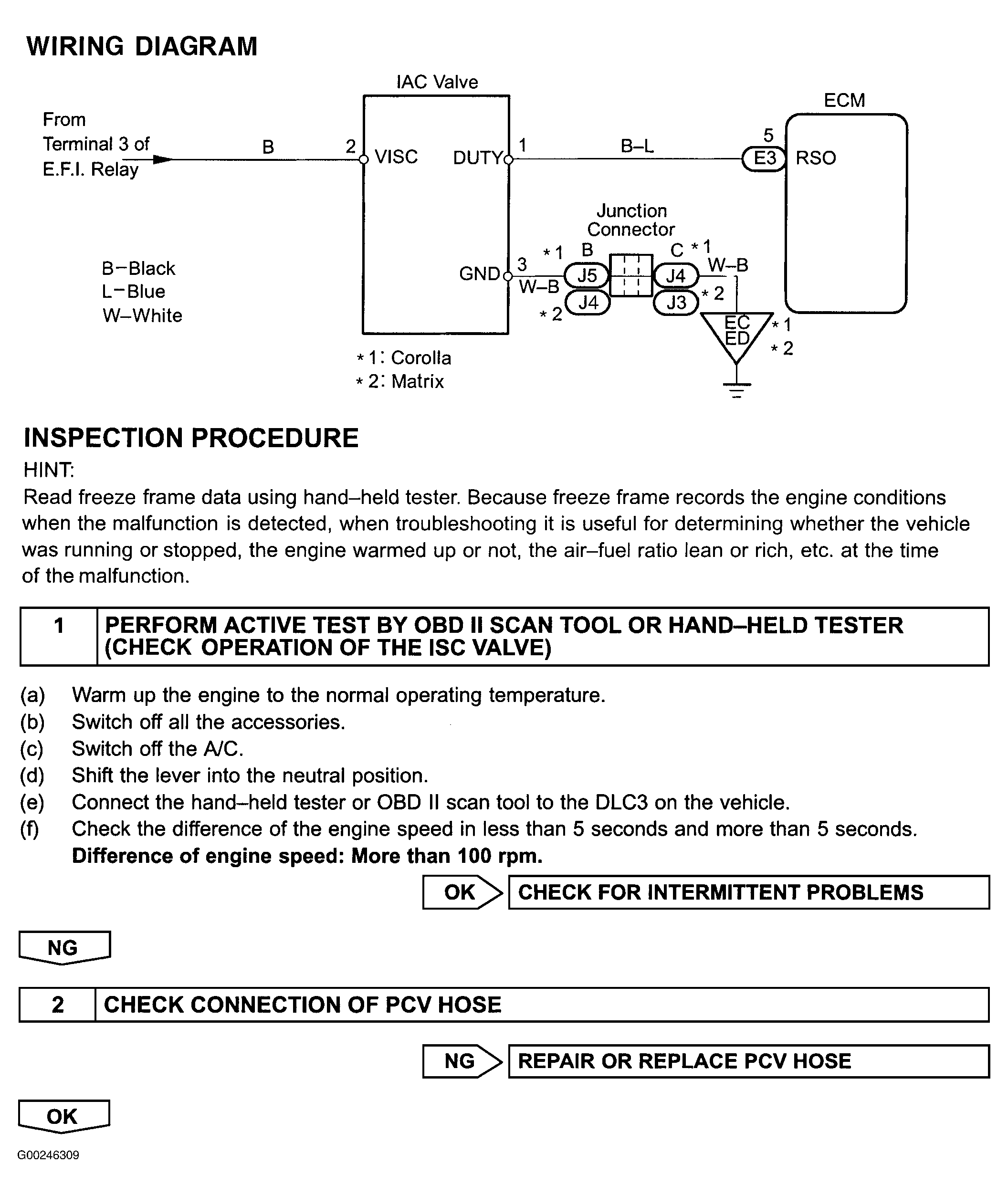 Home >> Toyota >> 2003 >> Matrix Base, FWD, Automatic >> Repair and Diagnosis (Single Page) >> Engine Performance >> System >> Engine Control System Self Diagnostics >> Diagnostic Tests >> DTC P0505: Idle Control System Malfunction >> Diagnosis & Repair