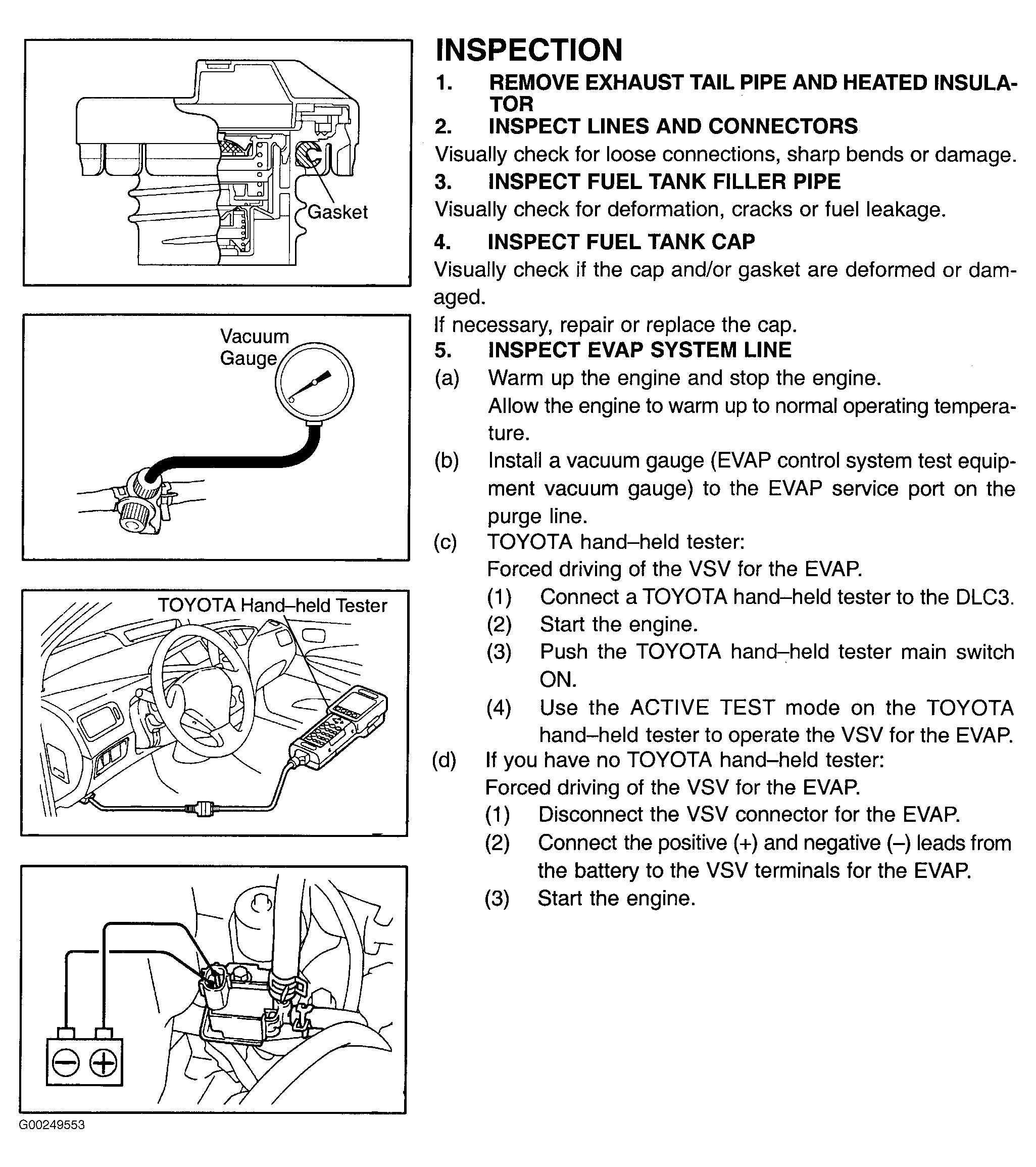 Home >> Toyota >> 2003 >> Matrix Base, FWD, Automatic >> Repair and Diagnosis (Single Page) >> Engine Performance >> System >> Engine Controls - System & Component Testing - 4-Cylinder >> Emission Systems & Sub-Systems >> Fuel Evaporative System >> Fuel EVAP System Test (Prius)