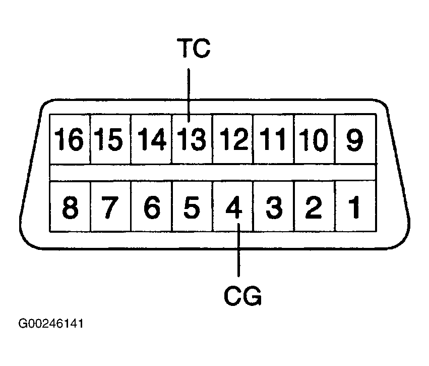 2. Turn ignition off. Apply parking brake and place transaxle in Neutral. Ensure A/C is off. Install Jumper Wire (SST 09843-18040) between terminals No. 4 (CG) and No. 13 (TC) on data link connector No. 3. See Figure. Data link connector No. 3 is located behind driver's side of instrument panel. See Figure.