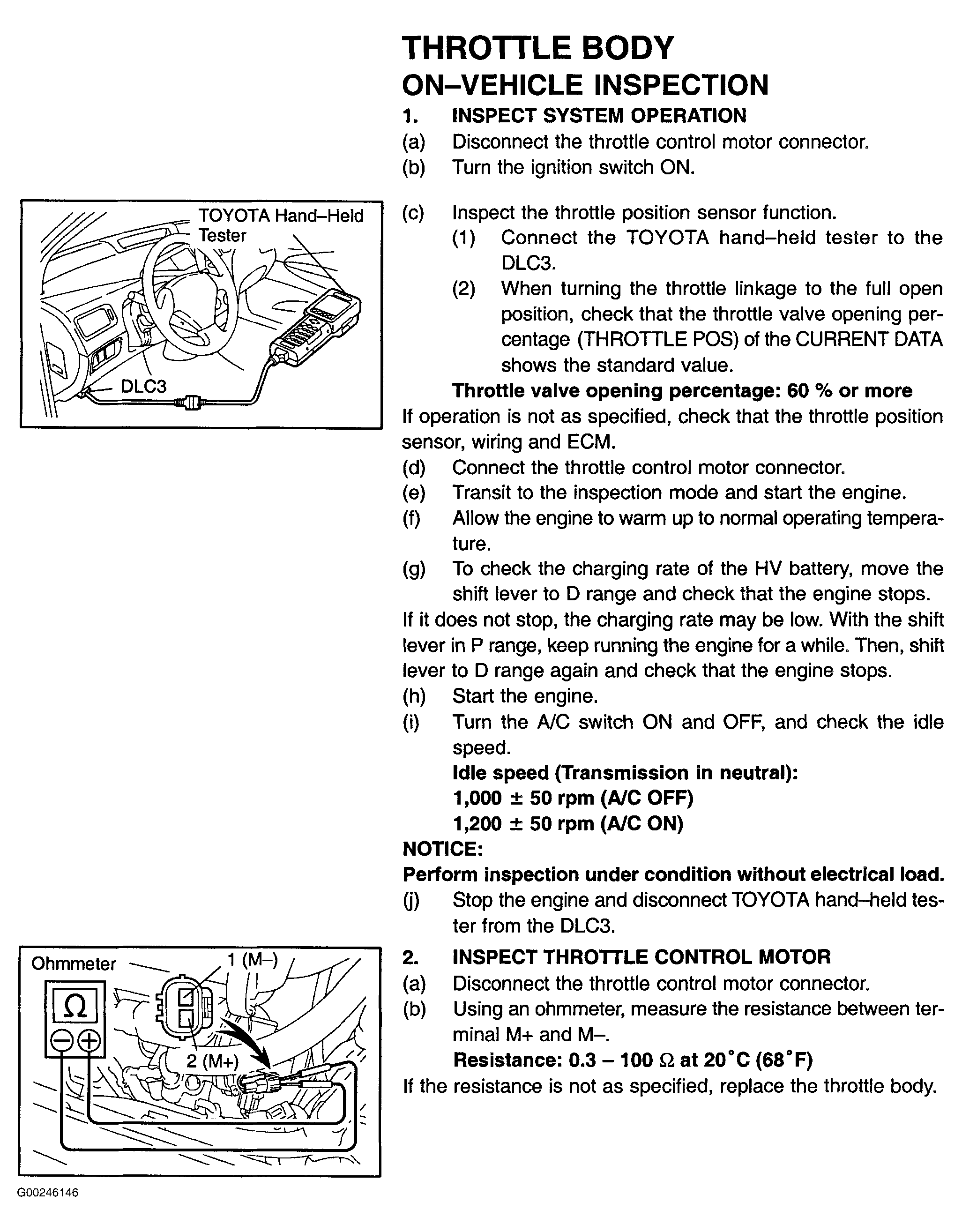 On Prius the throttle body is part of the Electronic Throttle Control System (ETCS). The ETCS is used for controlling idle speed. ETCS consists of throttle body, accelerator pedal position sensor, Throttle Position (TP) sensor, throttle control motor, Hybrid Vehicle Control Electronic Control Unit (HV ECU) and Engine Control Module (ECM). For throttle body inspection, see Fig 1-Fig 3 .