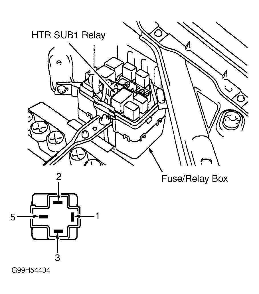 - To test HTR SUB1 relay operation, apply battery voltage and ground to terminals No. 1 and 2 on HTR SUB1 relay. Using ohmmeter, check that continuity exists between terminals No. 3 and 5 on HTR SUB1 relay. Replace HTR SUB1 relay if continuity does not exist between terminals No. 3 and 5.