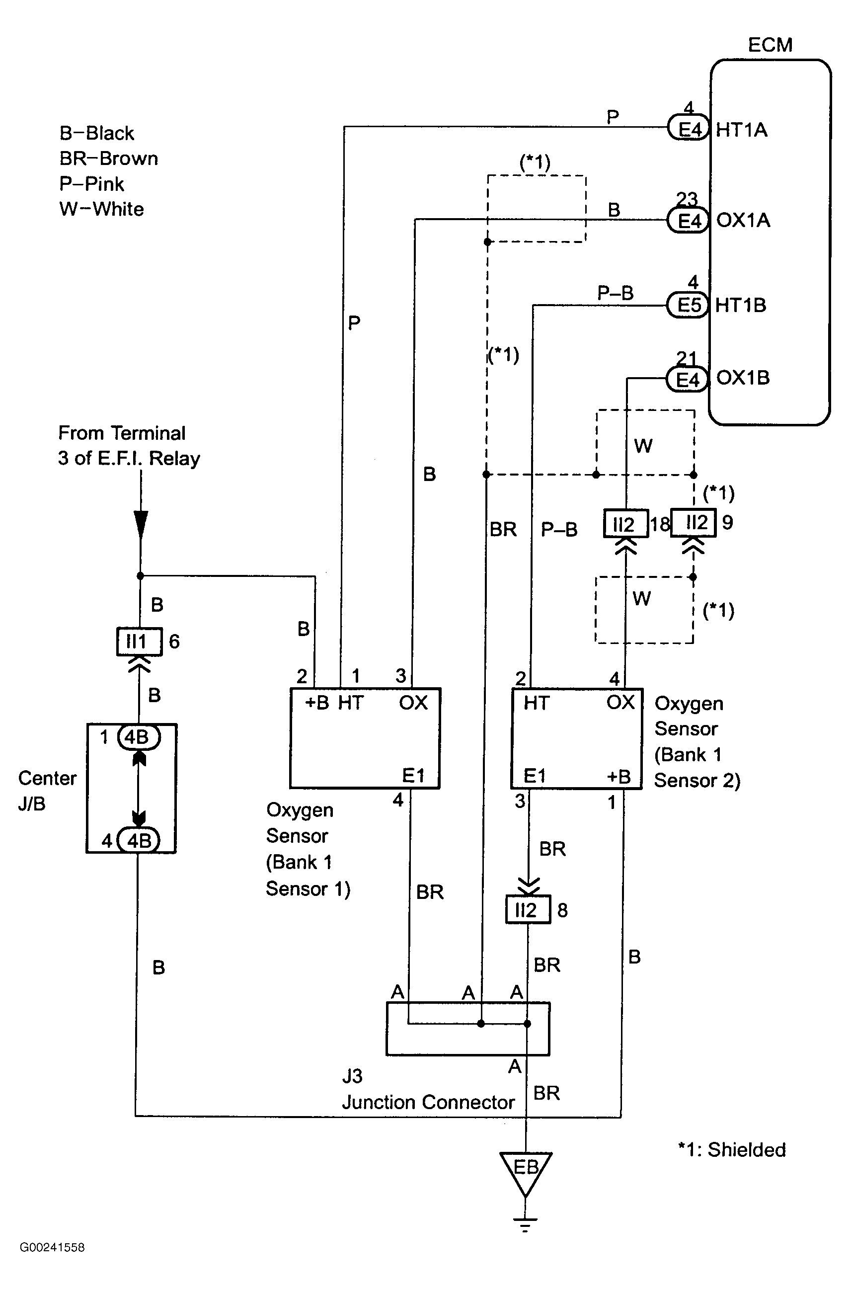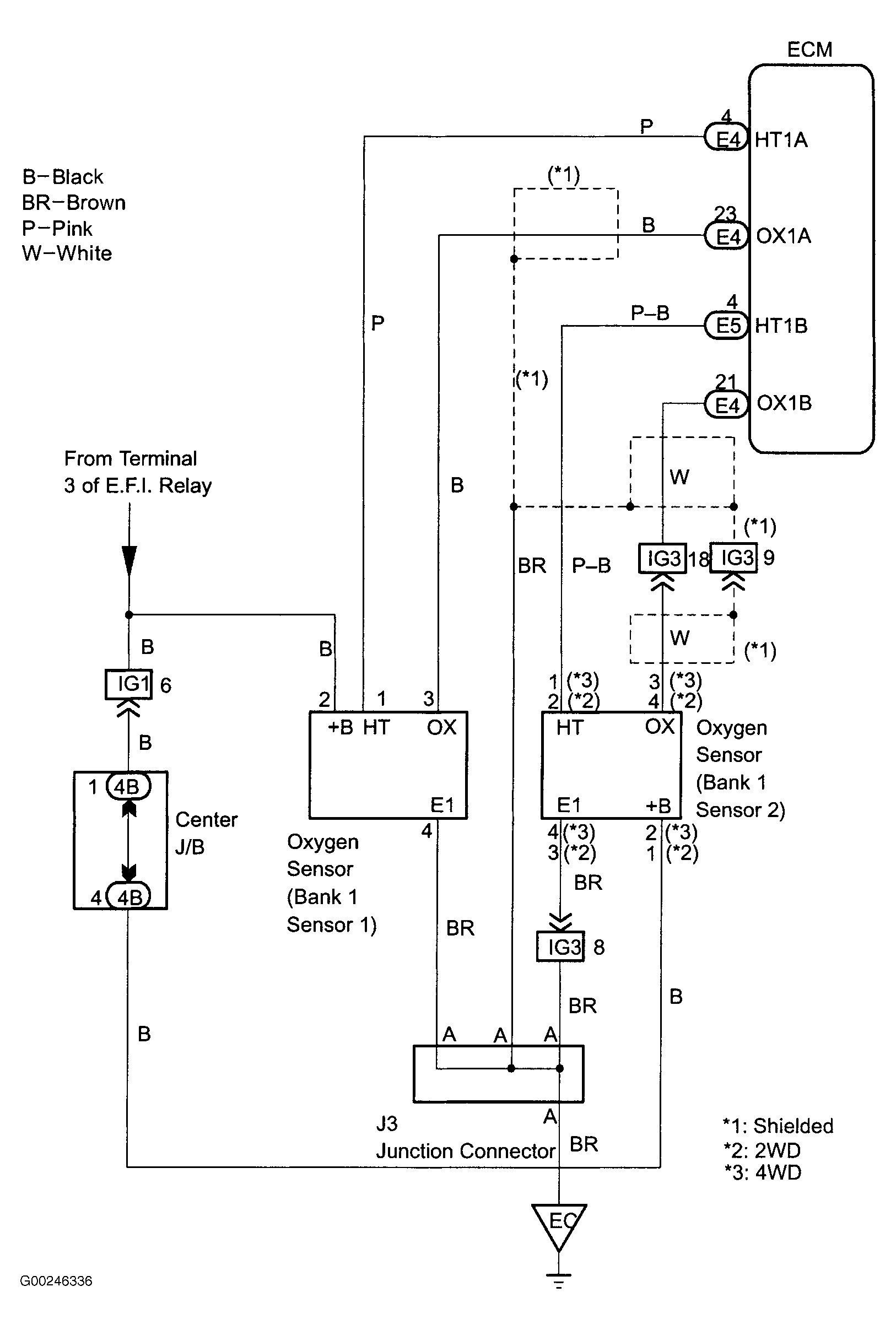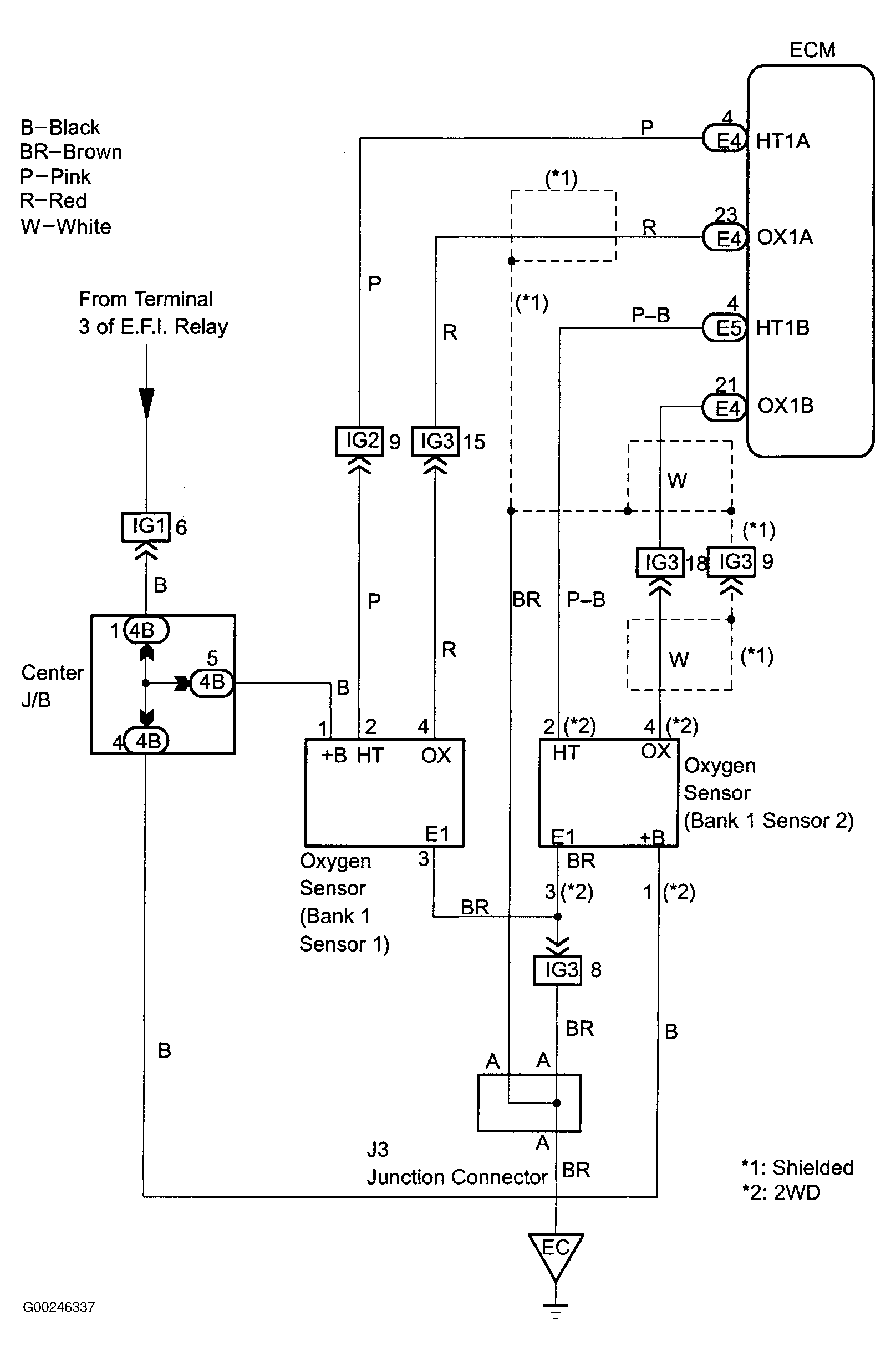 For wiring diagram of Corolla model, see Fig 1. For wiring diagram of Matrix (1ZZ-FE engine) model, see Fig 2. For wiring diagram of Matrix (2ZZ-GE engine) model, see Fig 3. For diagnosis and repair, see Fig 4-Fig 6 . For ECM location, see Figure. To go relevant DTC chart, see DIAGNOSTIC TROUBLE CODE DEFINITIONS . For vacuum hose routing, see VACUUM DIAGRAMS article. To identify circuits referenced in testing, see ENGINE PERFORMANCE in SYSTEM WIRING DIAGRAMS article in ELECTRICAL. For removal and installation of components, see REMOVAL & INSTALLATION - 4-CYLINDER article. For testing of systems or components, see BASIC DIAGNOSTIC PROCEDURES - 4-CYL article or SYSTEM & COMPONENT TESTING - 4-CYLINDER article. To check for intermittent problems, see INTERMITTENT PROBLEM CHECK  under SELF-DIAGNOSTIC SYSTEM. To check ECM inputs and outputs, see PIN VOLTAGE CHARTS article.