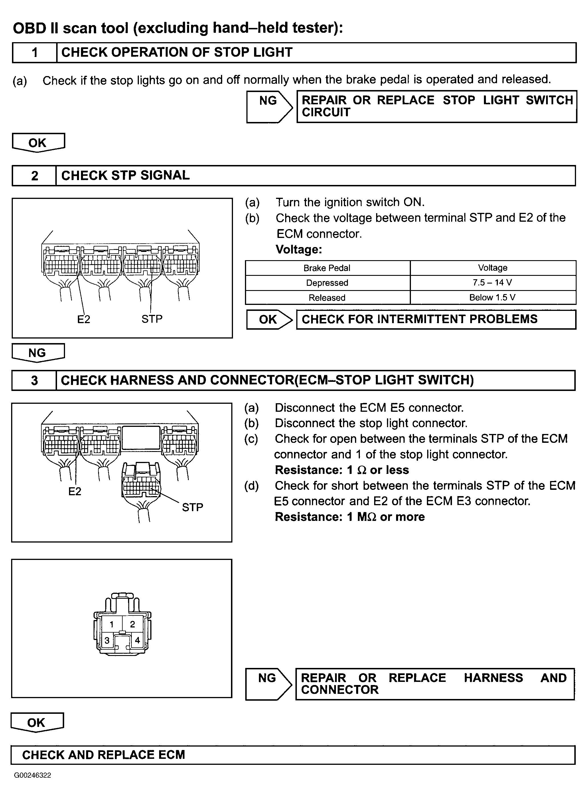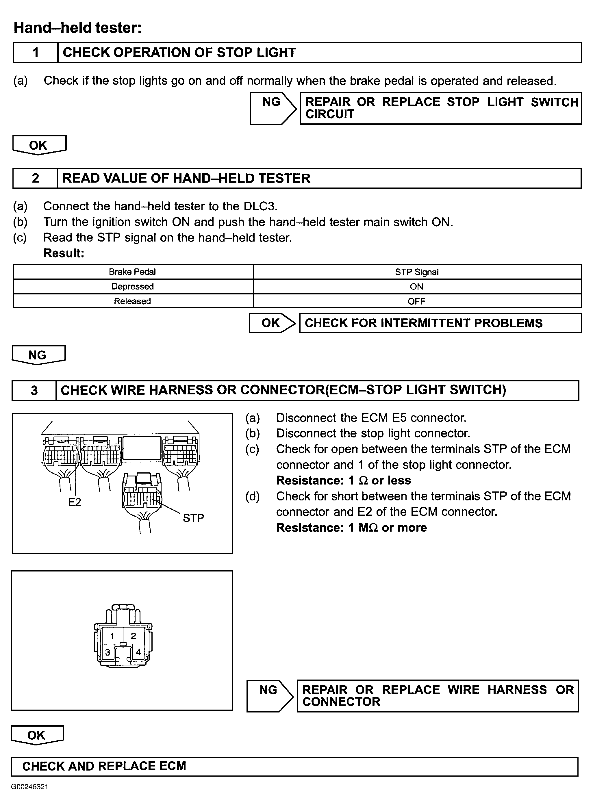 For wiring diagram of Corolla model, see Fig 1. For wiring diagram of Matrix model, see Fig 2. For diagnosis and repair with hand-held tester, see Fig 3. For diagnosis and repair with OBD II scan tool, see Fig 4. To check for intermittent problems, see INTERMITTENT PROBLEM CHECK  under SELF-DIAGNOSTIC SYSTEM. To identify circuits referenced in testing, See ENGINE PERFORMANCE in SYSTEM WIRING DIAGRAMS article in ELECTRICAL. To check ECM inputs and outputs, see PIN VOLTAGE CHARTS article. To replace ECM, see REMOVAL & INSTALLATION - 4-CYLINDER article.