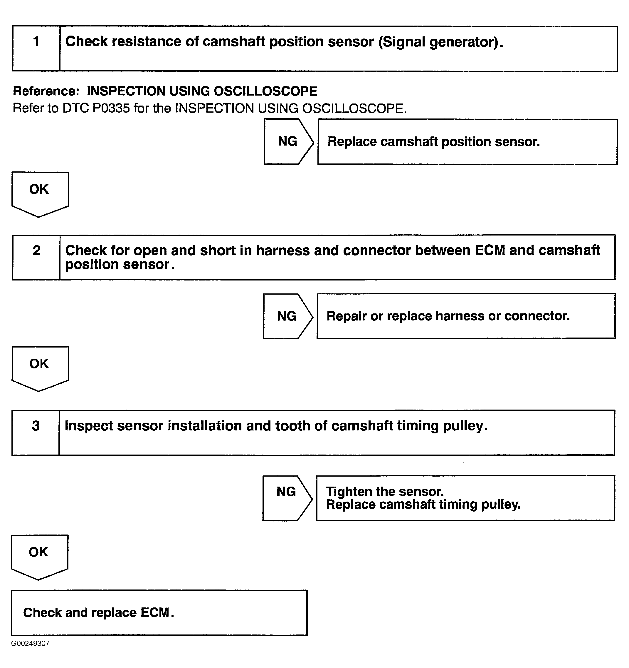 Home >> Toyota >> 2003 >> Matrix Base, FWD, Automatic >> Repair and Diagnosis (Single Page) >> External Pages >> Different car >> Section 104 (Engine Control System Self Diagnostics) >> Diagnostic Tests >> DTC P0340: Camshaft Position Sensor Circuit >> Diagnosis & Repair
