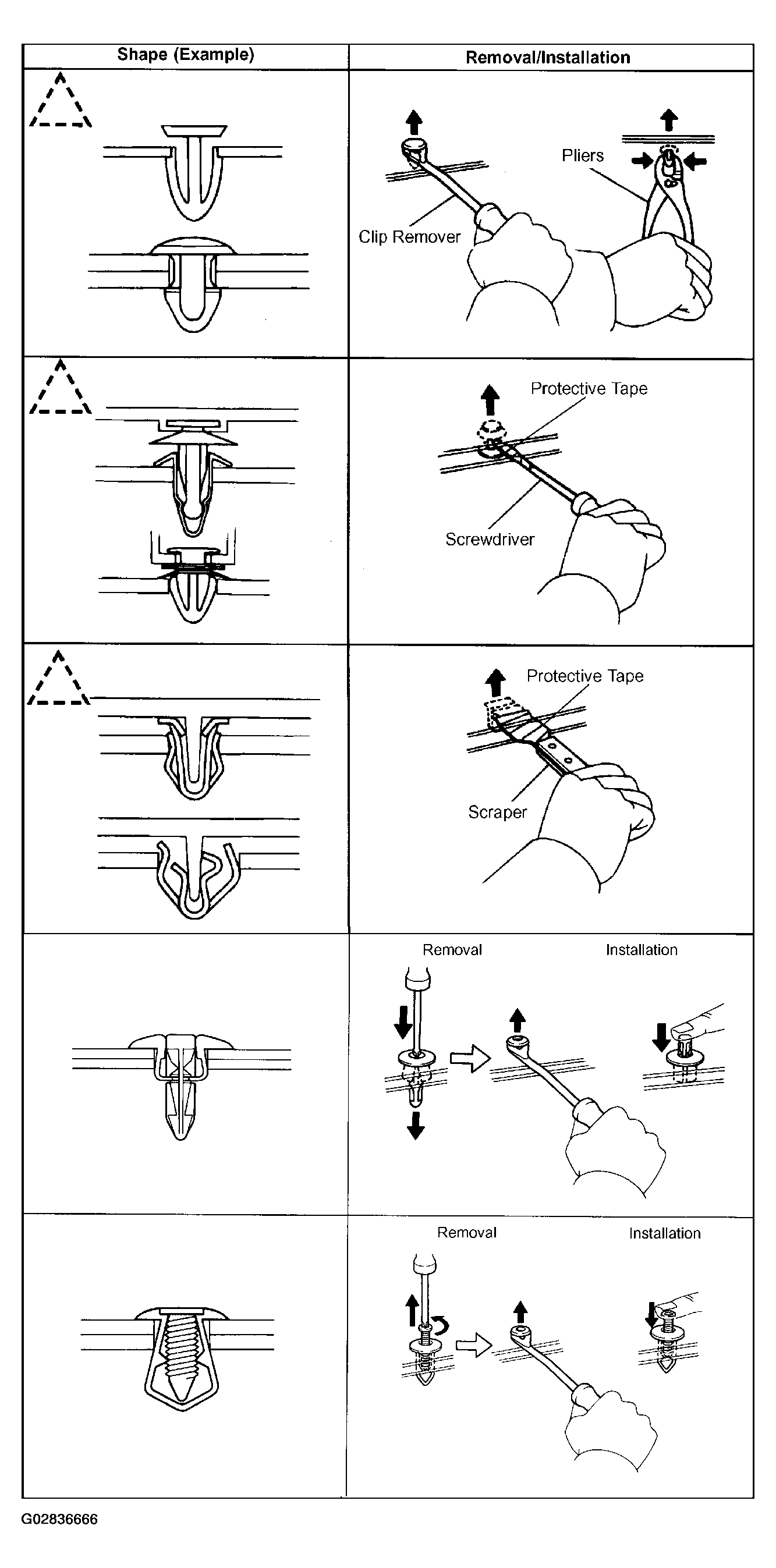 1. The removal and installation methods of typical clips used in body parts are shown in Fig 6.