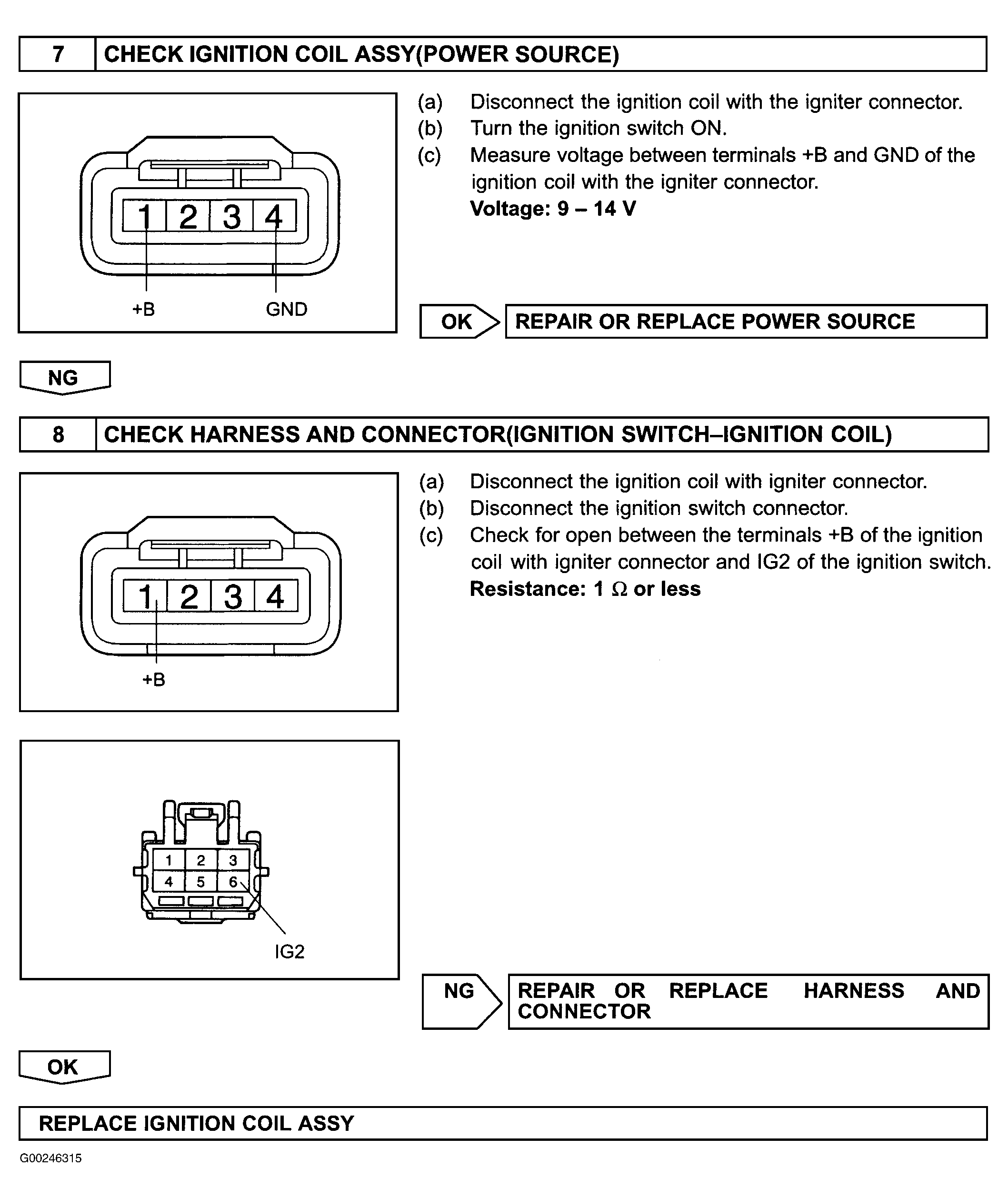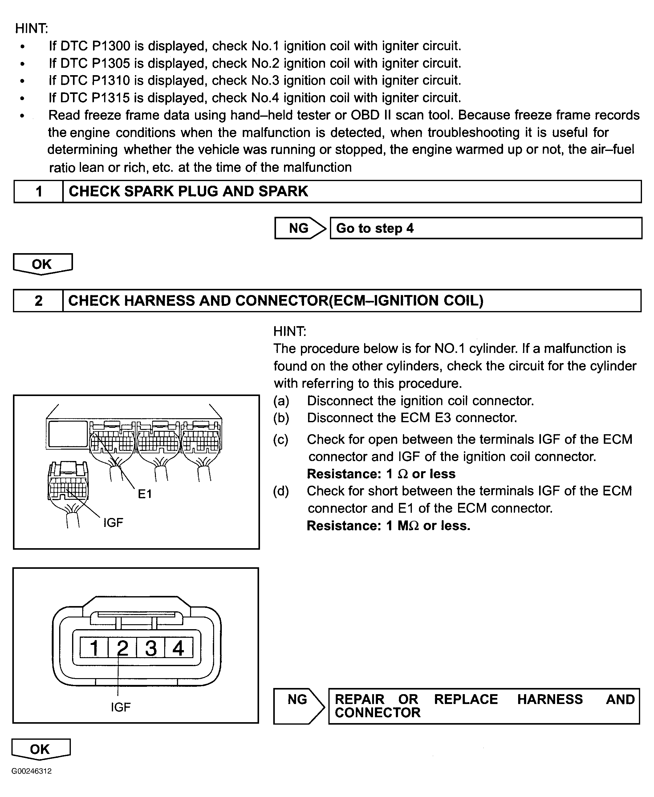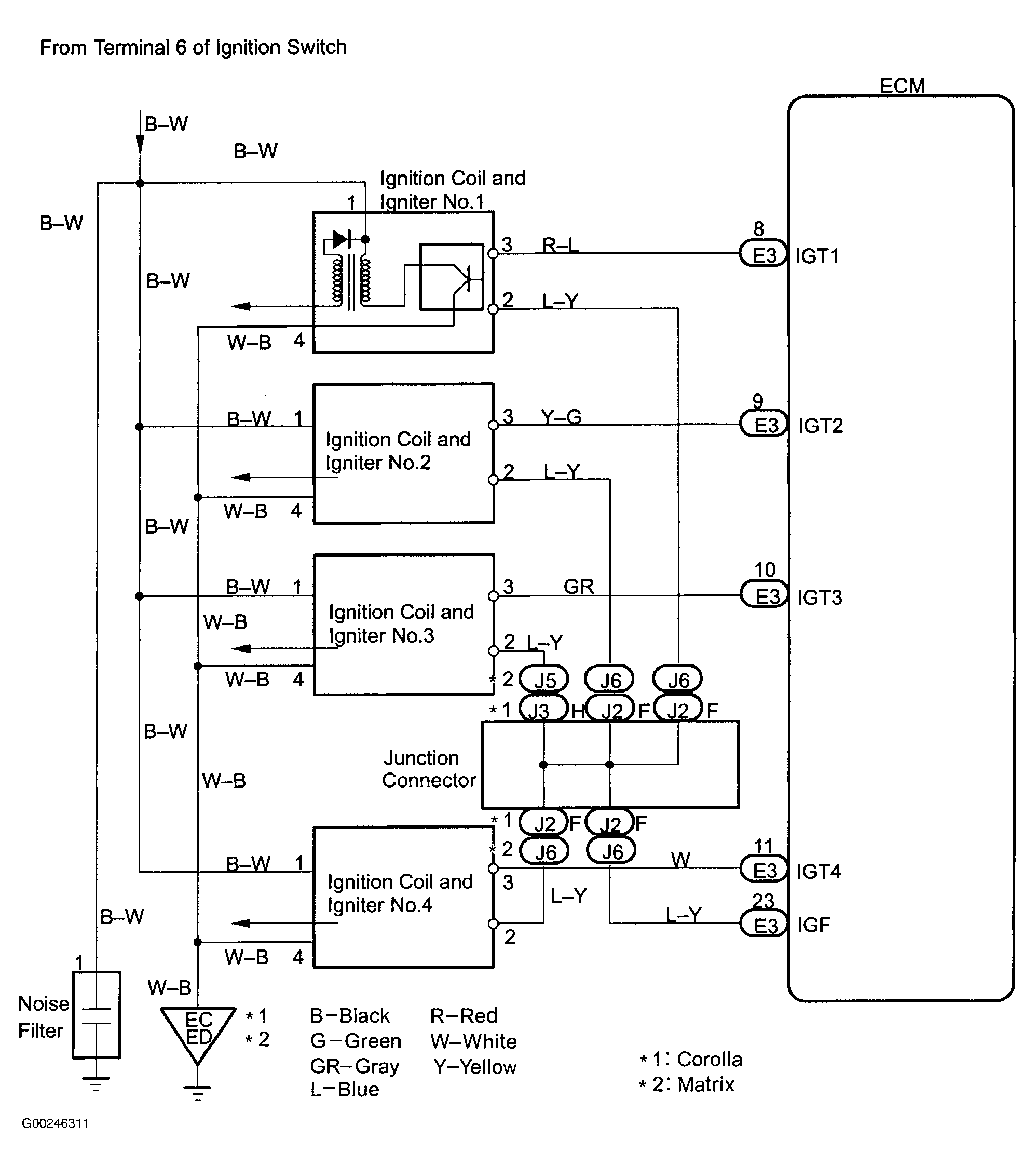 For wiring diagram, see Fig 1. For diagnosis and repair, see Fig 2-Fig 5 . For testing of components, see BASIC DIAGNOSTIC PROCEDURES - 4-CYL article. To identify circuits referenced in testing, See ENGINE PERFORMANCE in SYSTEM WIRING DIAGRAMS article in ELECTRICAL. For removal and installation of components, see REMOVAL & INSTALLATION - 4-CYLINDER article. To check ECM inputs and outputs, see PIN VOLTAGE CHARTS article.