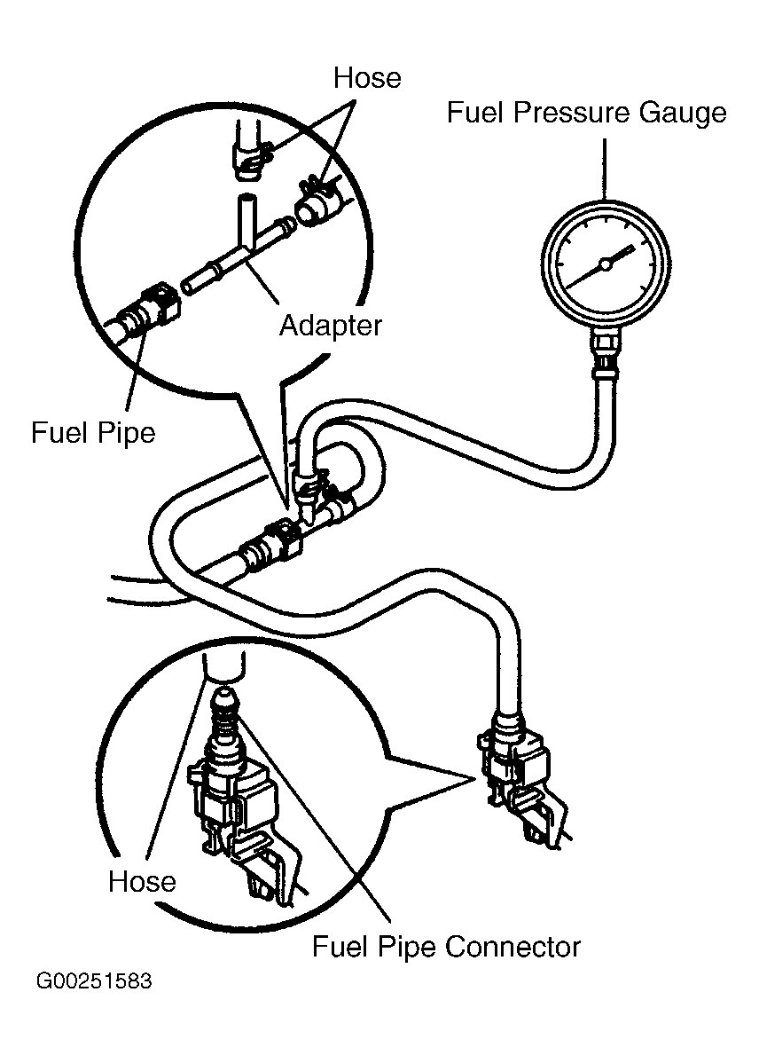- Release fuel pressure. Disconnect negative battery cable. Remove adapter, hose, fuel pressure gauge and fuel pipe connector.