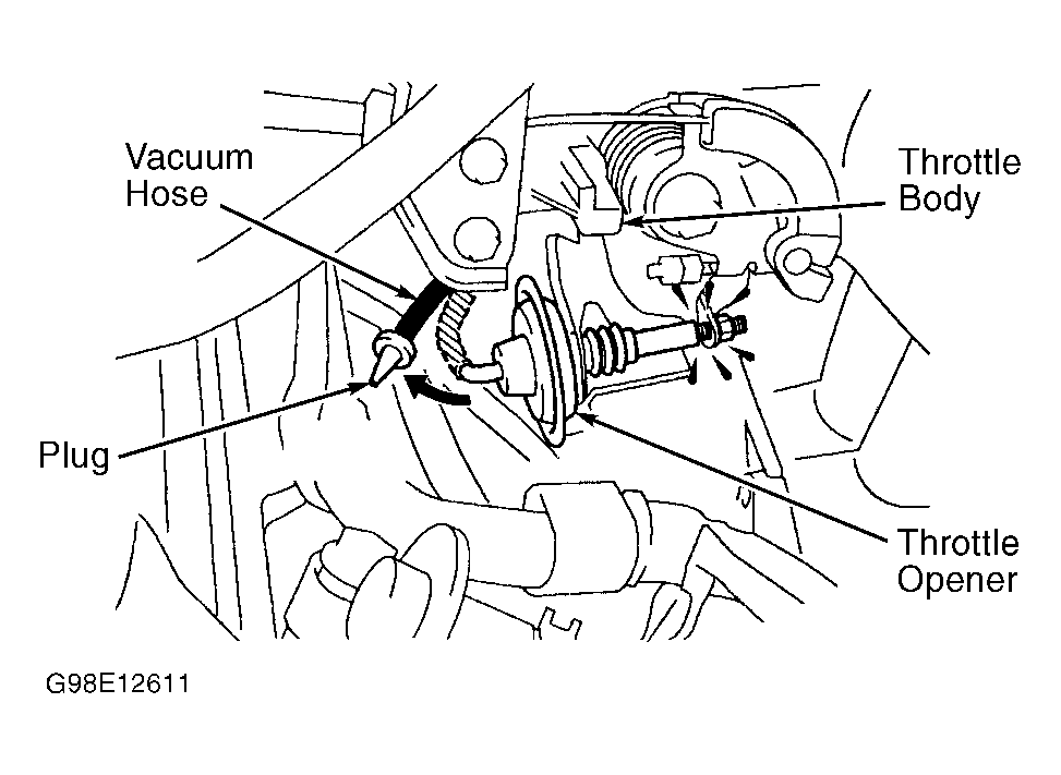 3. Throttle opener is nonadjustable. If engine speed is not within specification, replace throttle body. See THROTTLE BODY under FUEL SYSTEMS in REMOVAL & INSTALLATION - 4-CYLINDER article. Shut engine off. Reinstall vacuum hose on throttle opener. Start engine and ensure engine returns to proper idle speed.