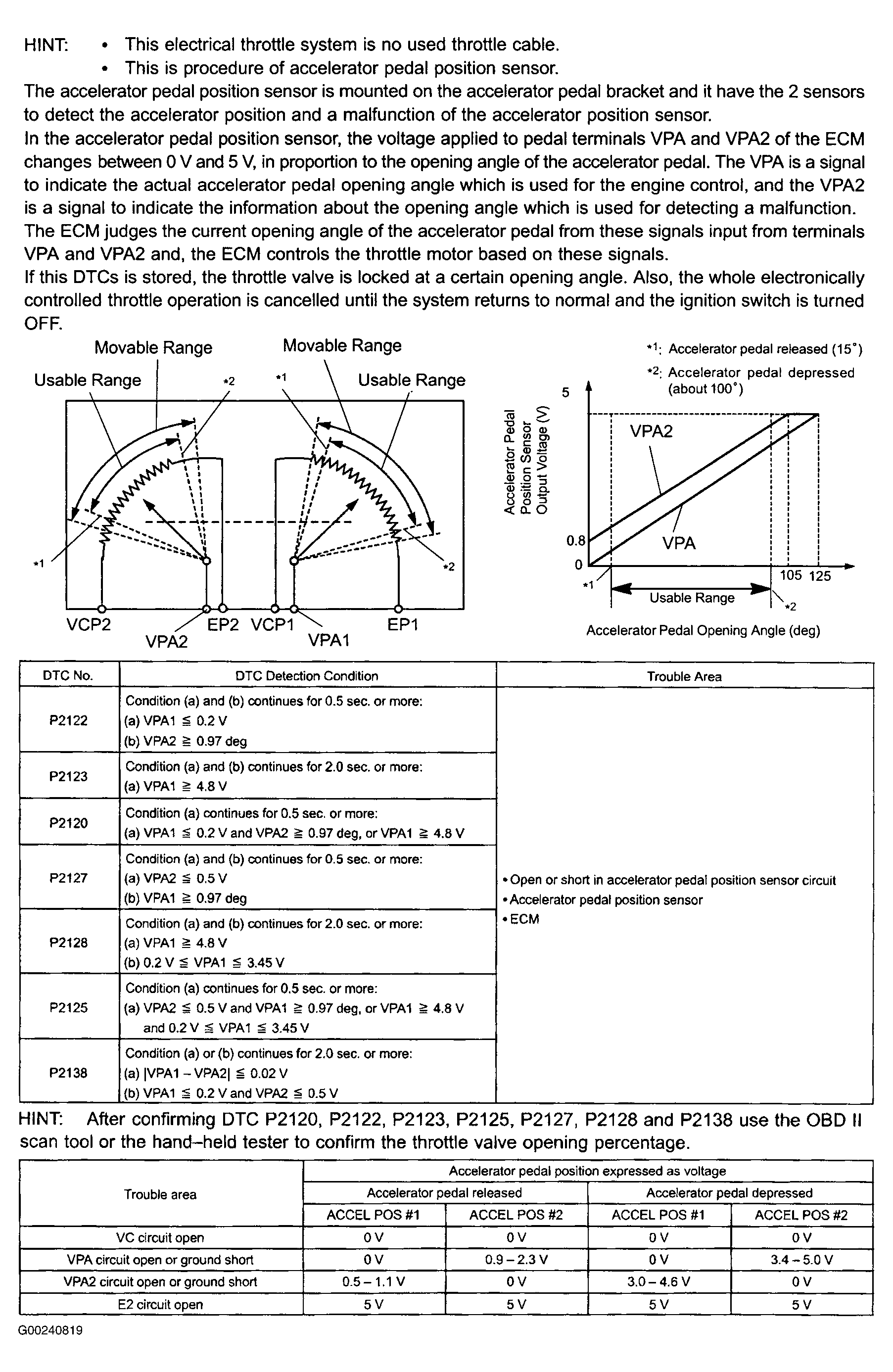 Home >> Toyota >> 2003 >> Matrix Base, FWD, Automatic >> Repair and Diagnosis >> External Pages >> Different car >> Section 101 (Engine Control System Self Diagnostics - 4-Cylinder) >> Diagnostic Tests >> DTC P2120, DTC P2122, DTC P2123, DTC P2125, DTC P2127, DTC P2128 & DTC P2138 >> Circuit Description & Possible Causes