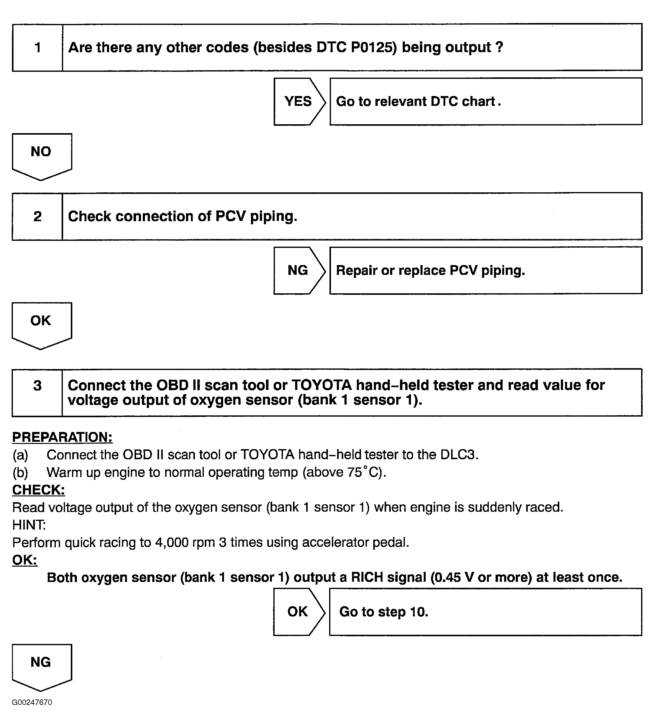 After confirming DTC P0125, use Toyota hand-held tester or scan tool to access CURRENT DATA to read heated oxygen sensor (B1 S1) output voltage. If output voltage is always less than 0.1 volt, heated oxygen sensor (B1 S1) circuit may be open or shorted. Using hand-held tester or scan tool, read FREEZE FRAME data. Freeze frame data records engine conditions when malfunction is detected.