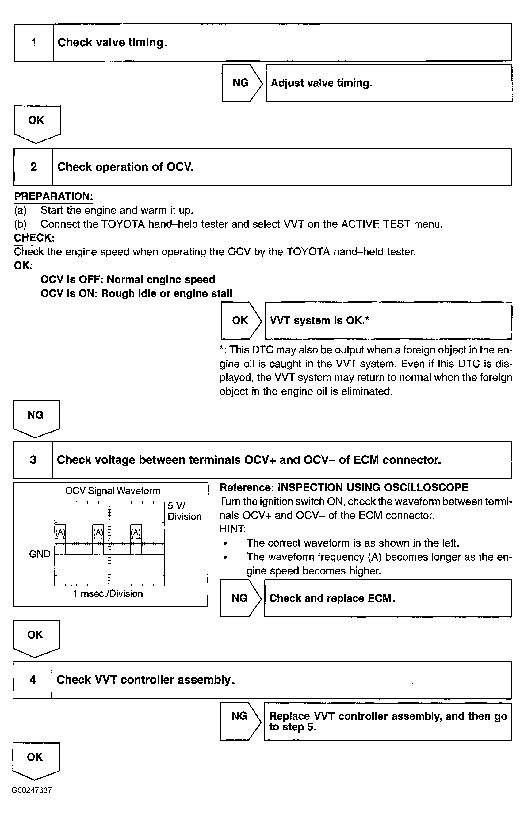 Home >> Toyota >> 2003 >> Matrix Base, FWD, Automatic >> Repair and Diagnosis >> External Pages >> Different car >> Section 104 (Engine Control System Self Diagnostics) >> Diagnostic Tests >> DTC P1349: Variable Valve Timing System Malfunction >> Diagnosis & Repair