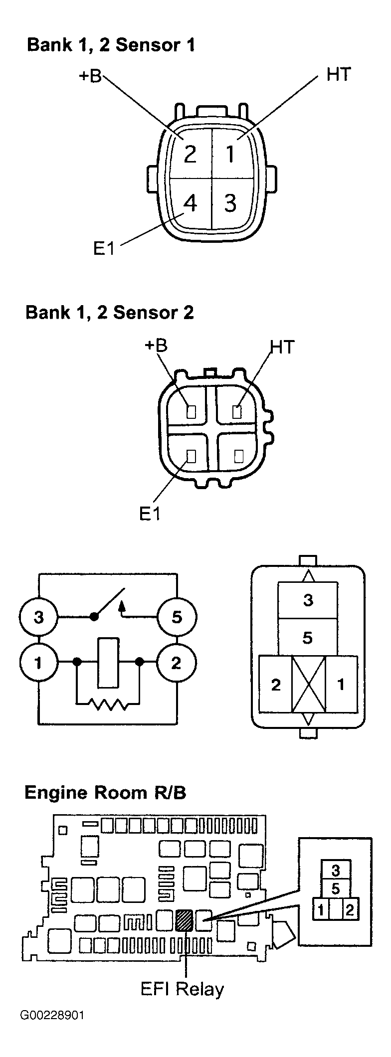 - ECM 35-pin connector E5 terminal No. 4 (HT1A) and HO2S (Bank 1 Sensor 1) terminal No. 1. Continuity should exist.