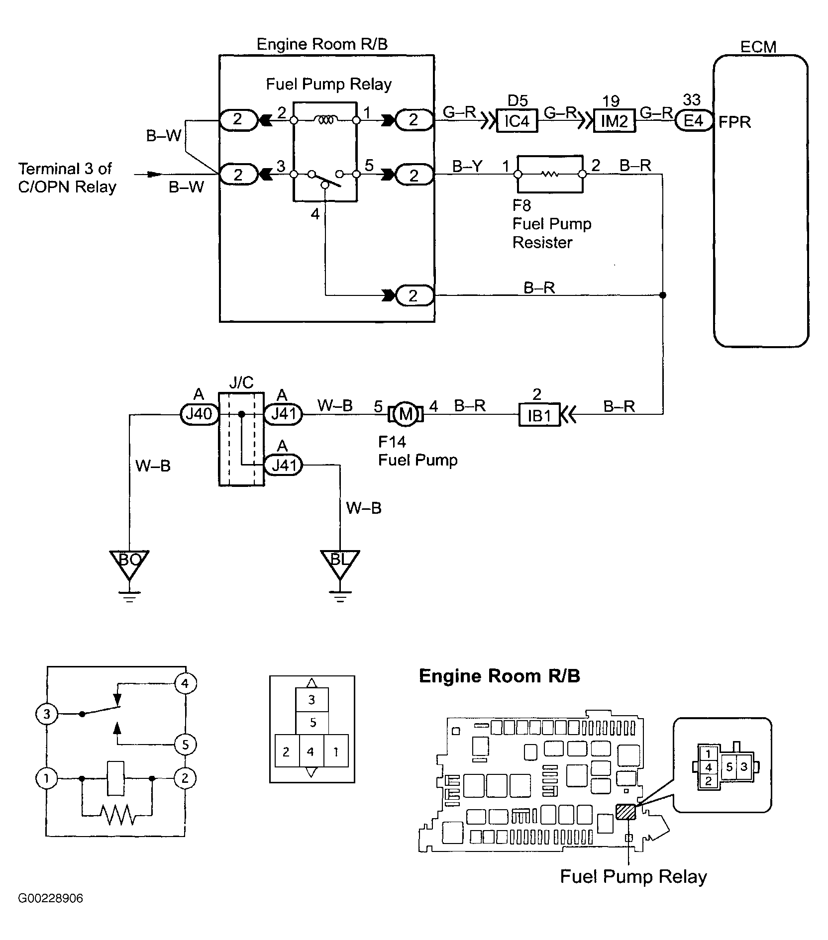 - Disconnect ECM 34-pin connector E4. Check continuity between fuel pump relay socket terminal No. 1 and ECM 34-pin connector terminal No. 33 (Green/Red wire). Continuity should exist. Then, check continuity between fuel pump relay socket terminal No. 1 and ground. Continuity should not exist. If continuity is as specified, replace ECM. If continuity is not as specified, repair or replace harness wires or connectors as necessary.