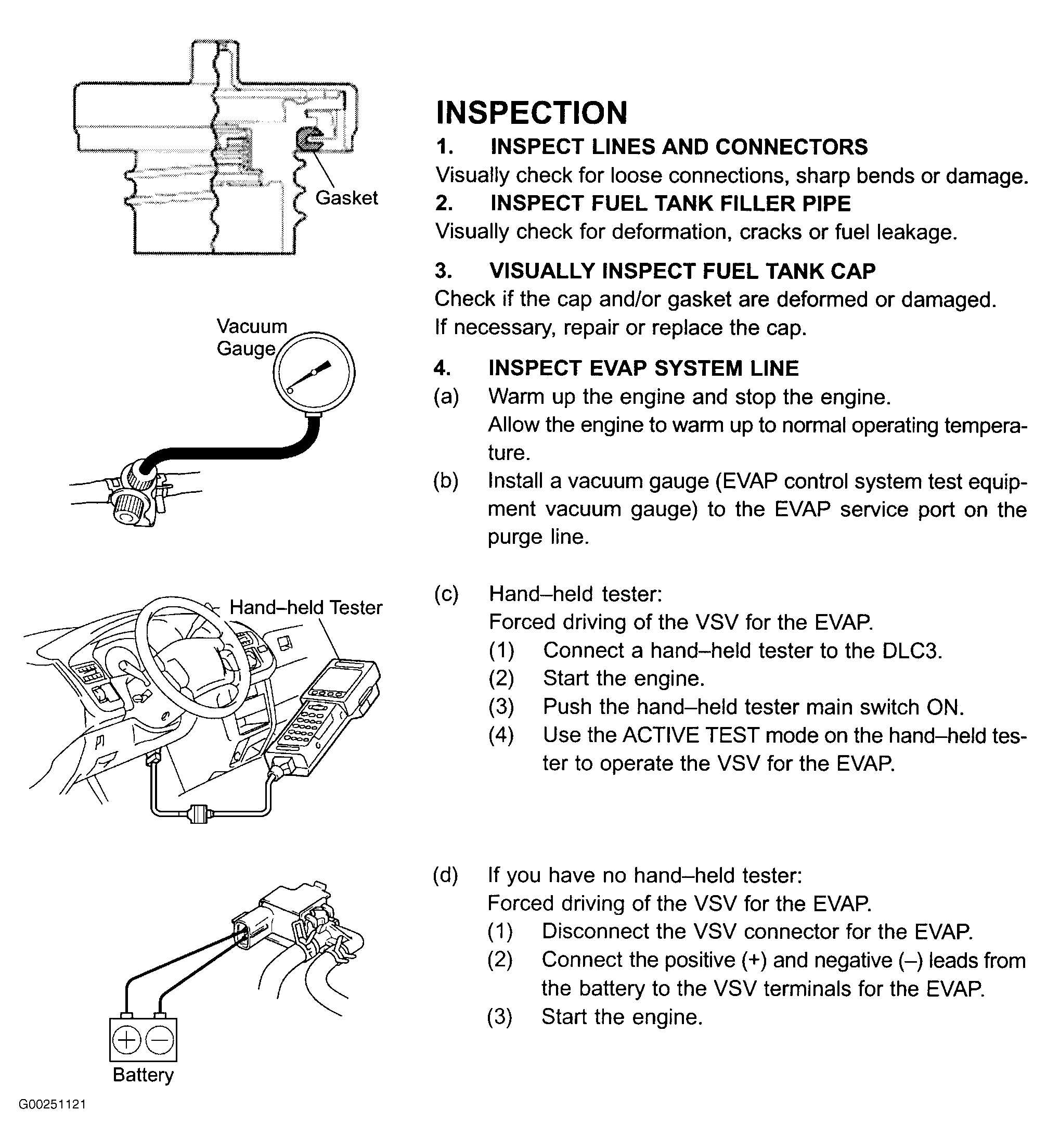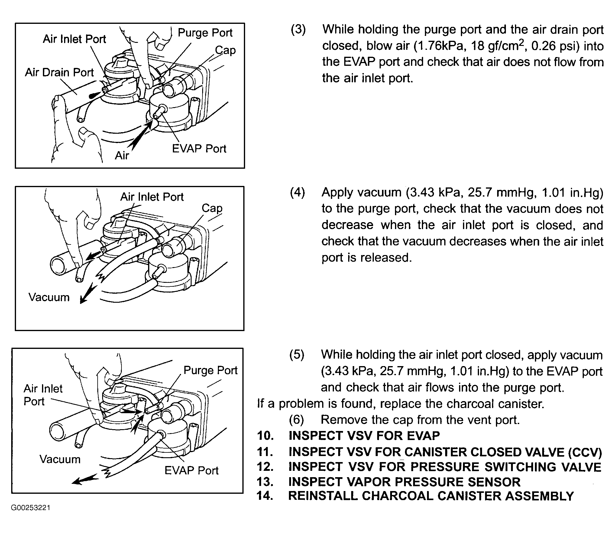 For fuel EVAP system test, see Fig 1-Fig 5 . To inspect VSV for EVAP, see EVAP VACUUM SWITCHING VALVE (ALL MODELS) . To inspect VSV for Canister Closed Valve, see CANISTER CLOSED VALVE VACUUM SWITCHING VALVE (AVALON, CAMRY, CAMRY SOLARA, HIGHLANDER & SIENNA) . To inspect VSV for pressure switching valve, see PRESSURE SWITCHING VALVE VACUUM SWITCHING VALVE (AVALON, CAMRY, CAMRY SOLARA, HIGHLANDER, LAND CRUISER, SEQUOIA, SIENNA & TACOMA) . To inspect vapor pressure sensor, see VAPOR PRESSURE SENSOR (SIENNA) .