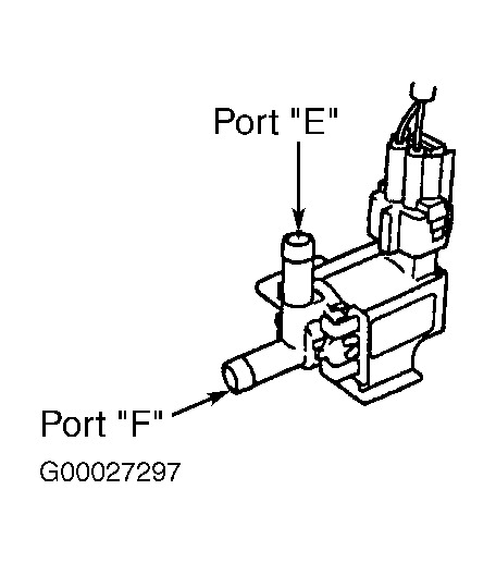 - Disconnect EVAP VSV vacuum hoses. Turn ignition on. Access ECM behind glove box. See Figure. Connect a jumper wire by backprobing between ground and terminal No. 6 (Black/Red wire) at ECM harness connector E8. See Figure. With jumper wire connected, air applied to EVAP VSV port "E" should flow from port "F". See Fig 1. Remove jumper wire. With jumper wire removed, air applied to EVAP VSV port "E" should not flow from port "F". If EVAP VSV does not function as specified, go to next step. If EVAP VSV functions as specified, go to step 16.